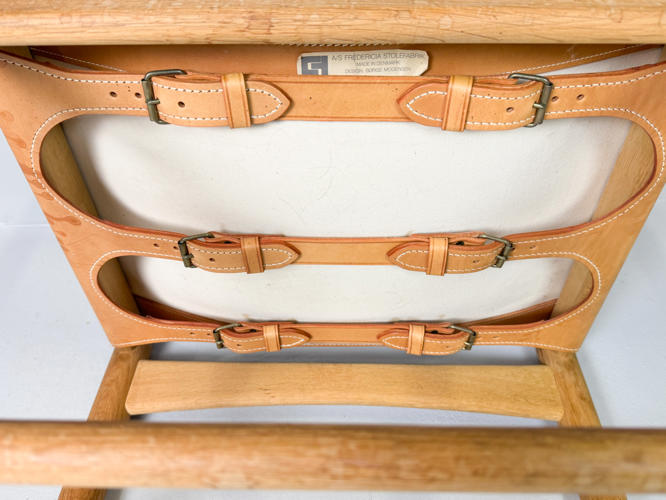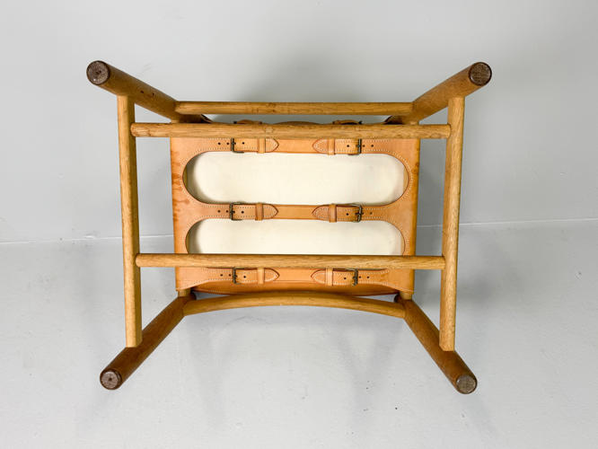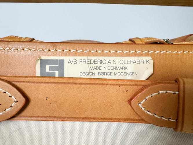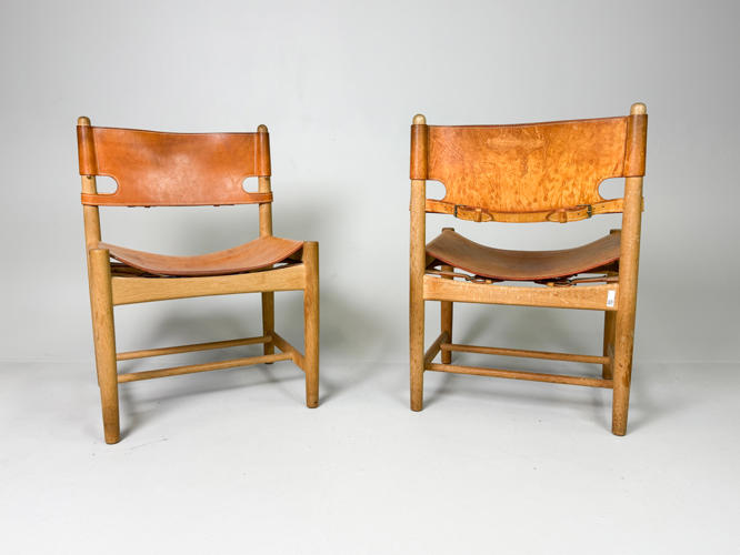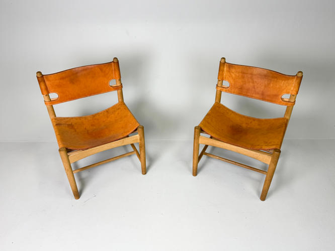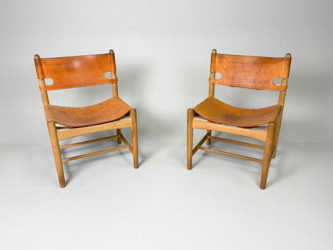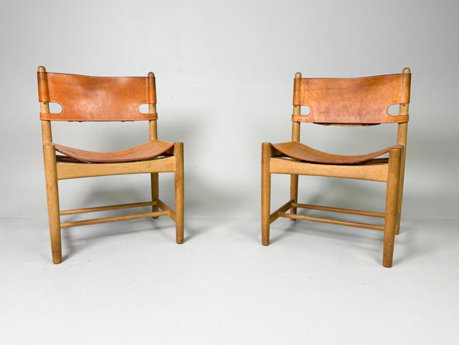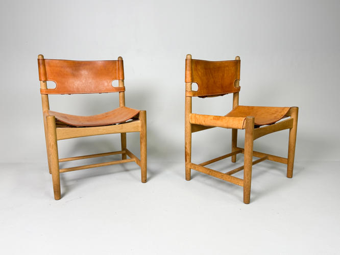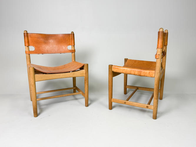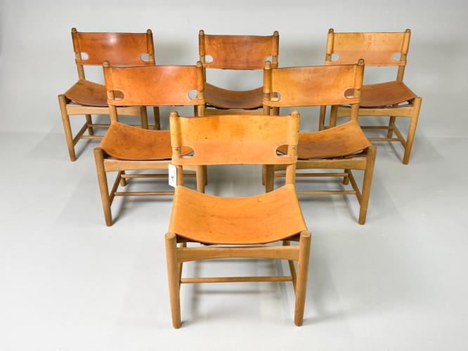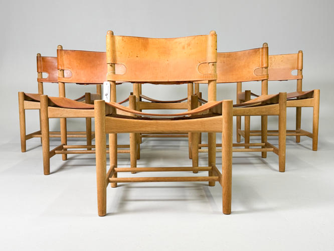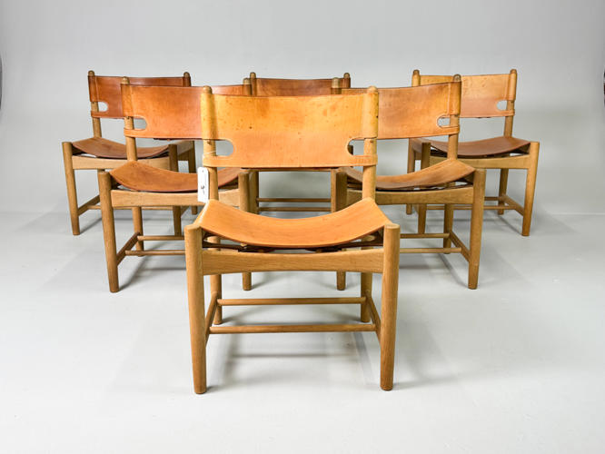 Set of six chairs with oak frame. Seat and back upholstered in patinated full-grain leather. Model 3237. Made and labelled at Fredericia Stolefabrik. Literature: "Danish Chairs", Noritsugu Oda, pp. 130-131. Shows signs of age and wear. Some scratches and marks. Patinated leather with stains. One chair with marks on one crossbar.