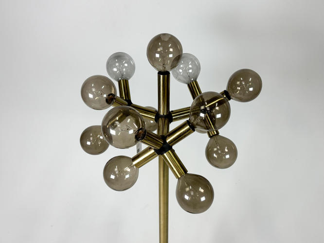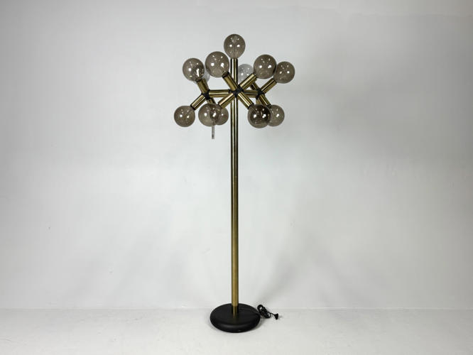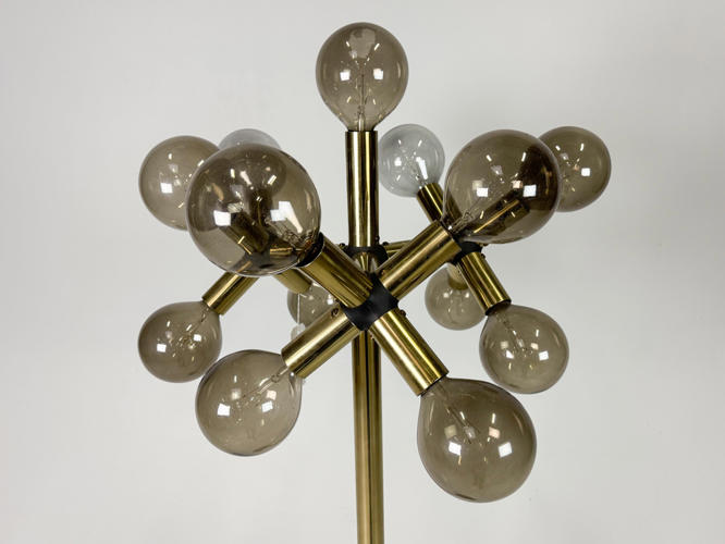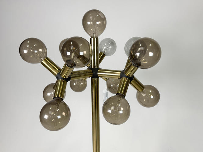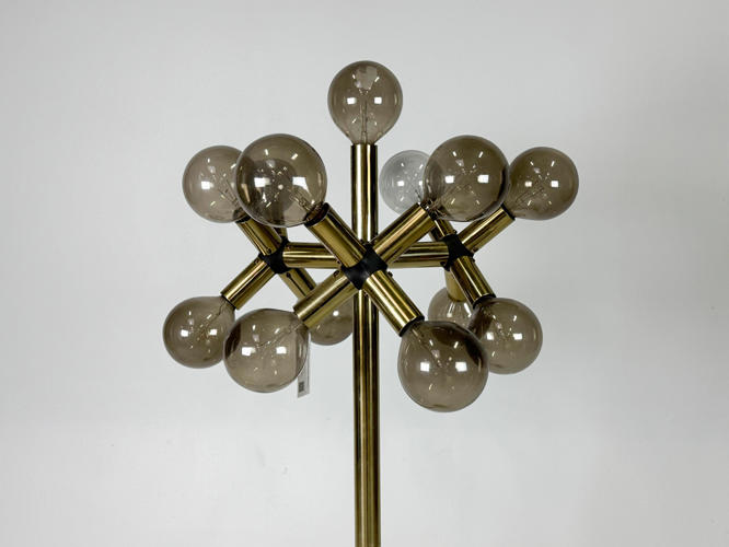 Floor lamp in brass lacquered aluminium with 13 lights. Centre piece of black plastic. On round base of black lacquered metal. Made by Swiss Lamps International, 1960s. H. 165. The lamp worked during inspection.