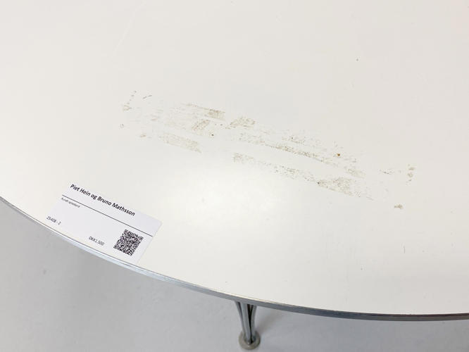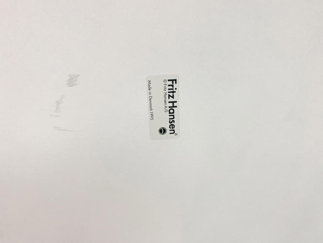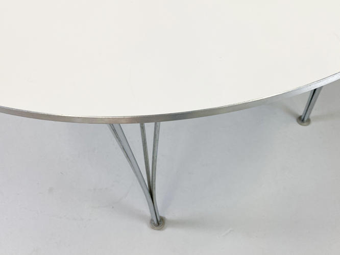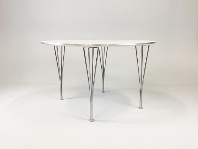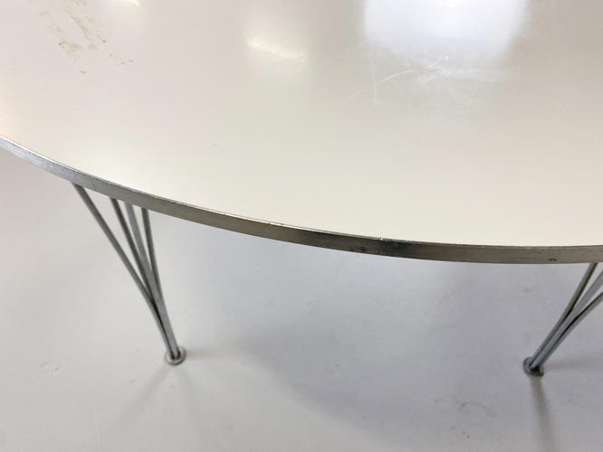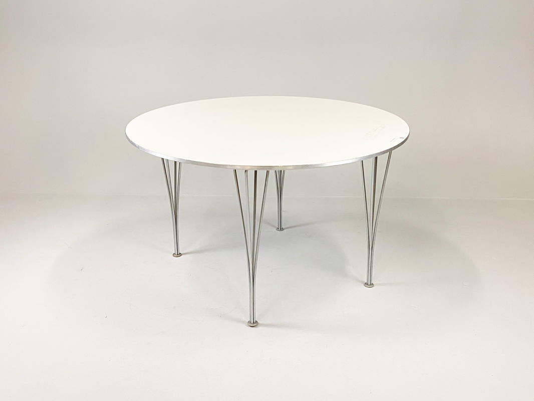 Round dining table with white laminate top. Coffin with aluminium. H. 71 cm. Diam. 120 cm. Produced by Fritz Hansen in 1995 with a label from here.