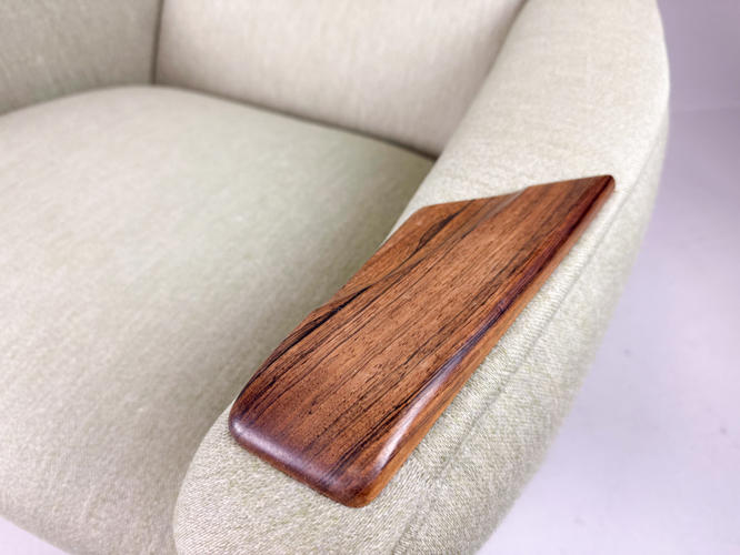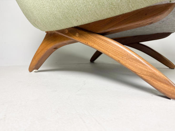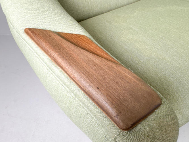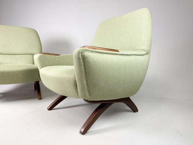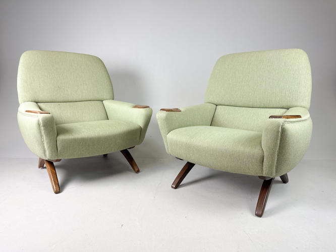Par lænestole. Model 62/Geisha. Fuldpolstret med grønt uld. Én med negle af palisander samt én med negle af teaktræ. Opsat på skråtstillede ben af teaktræ. Produceret hos Møbelfabrikken Kronen, ca. 1960-69. H. 92 cm. B. 82 cm. D. 80 cm.
