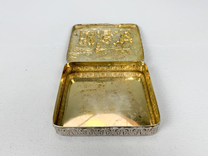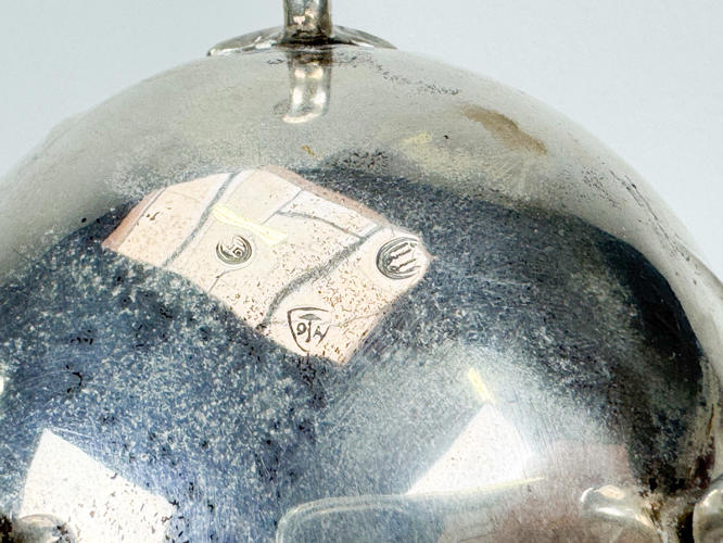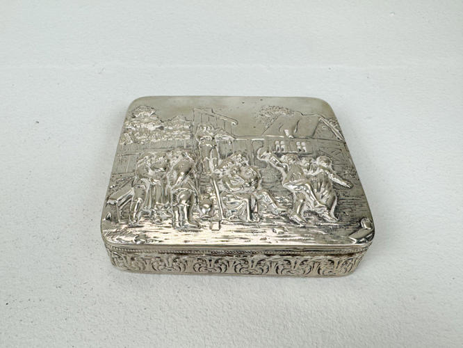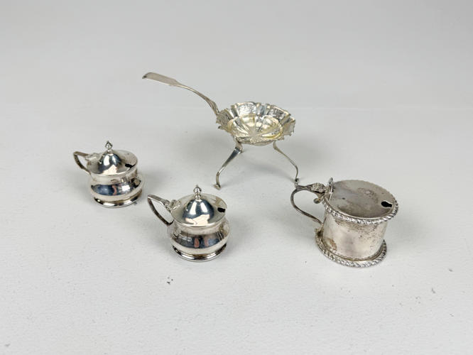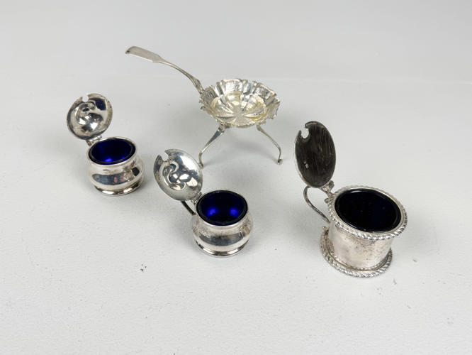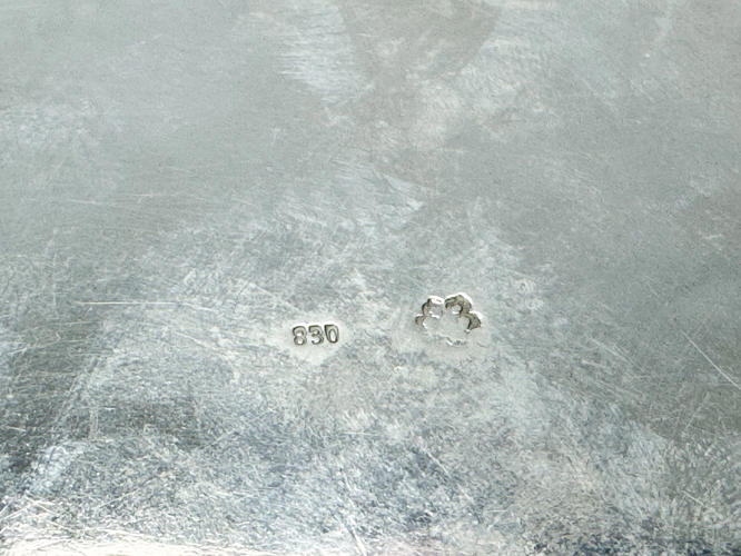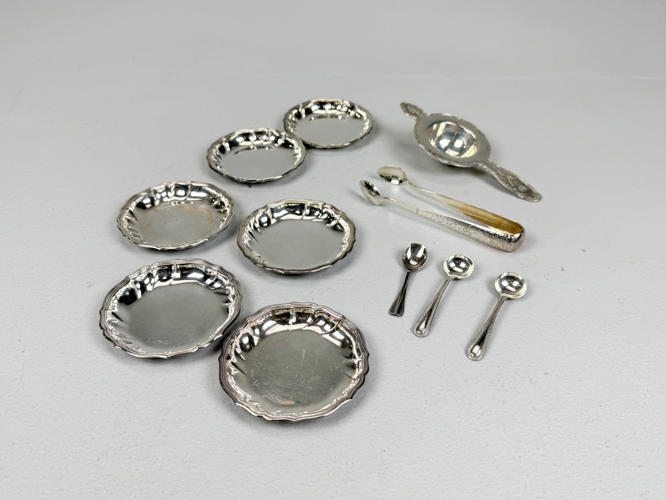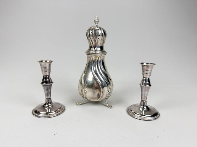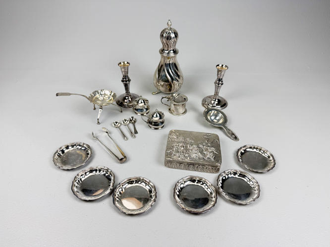Samling sølv stemplet med tre tårne, 830 m.m., bestående af strøbøsse, par fyldte stager, tesi samt holder, tre saltkrukker, seks glasbakker, sukkertang, cigaræske samt tre saltskeer, totalvægt uden dele med fyld og glas ca. 927 gr.