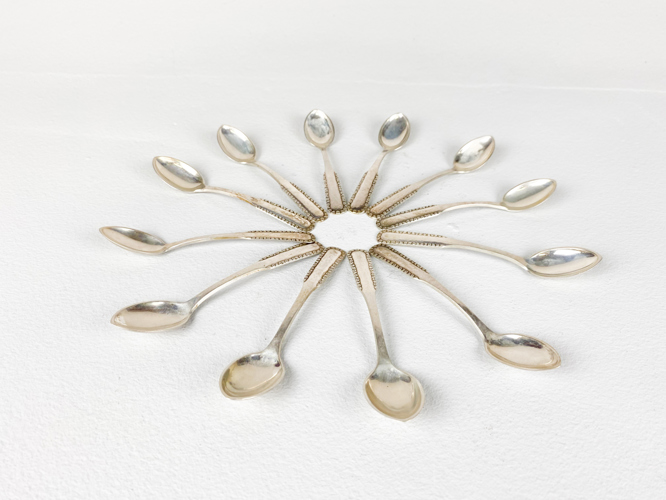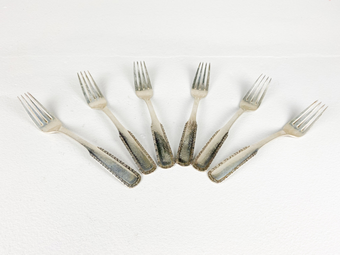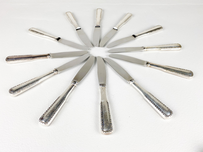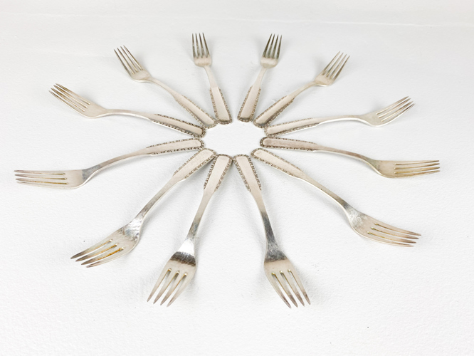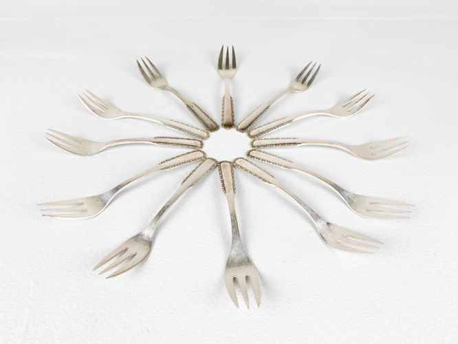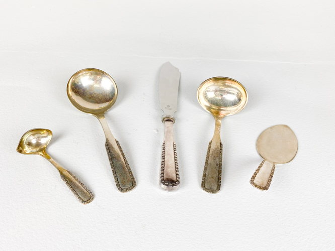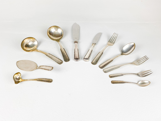Dele til bestik bestikservice, hammerslået sølv, stemplet 830 S, 'NW', bestående af 12 middagsknive, 6 middagsgafler, 11 frokostgafler, 12 dessertskeer, 12 kagegafler, 12 kaffeskeer, kartoffelske, sovseske, tarteletspade samt flødenæb. Vægt uden 13 dele med stål ca. 2.162 g.