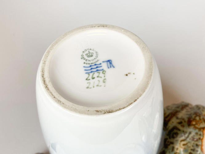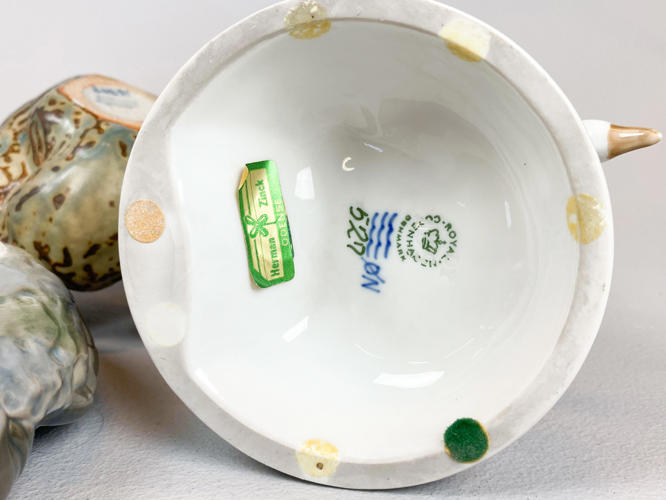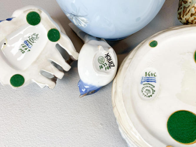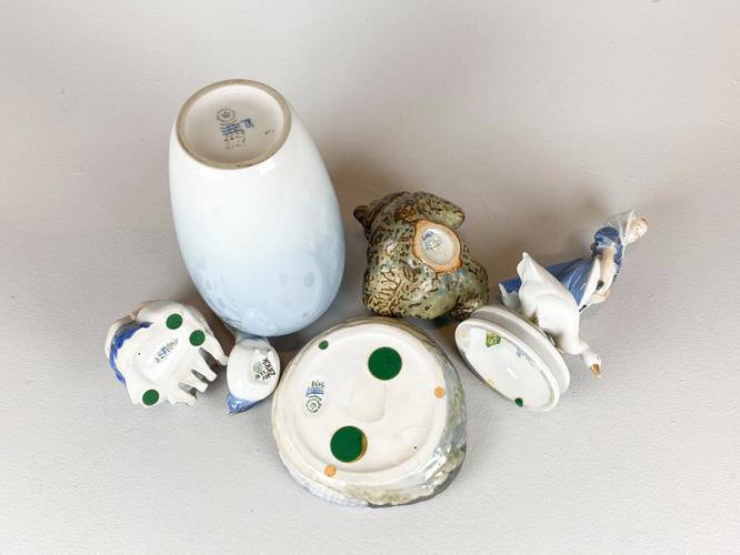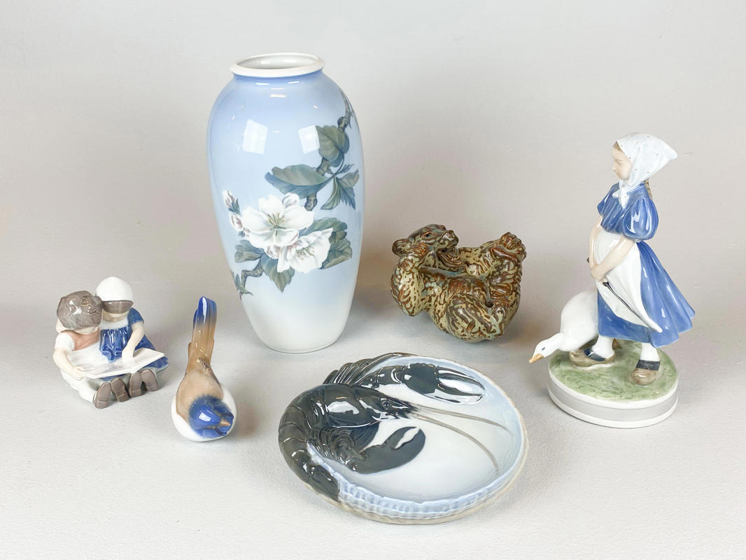 4 figurer, vase samt skål af porcelæn.Kgl. Vase nr. 2629/2129, Æblegren i blomst, 1. sort; Kgl. Pige med gås, nr. 527, 1. sort. Design Chr. Thomsen; B&G 1633, optimist, 1. sort, J. P. Dahl-Jensen; Kgl. 20271, liggende bjørn, 1. sort, Knud Kyhn; Kgl. skål med hummer, 3498, 1. sort. Jørgen Balsløv; B&G 1567, læsende børn, 1. sort. Ingeborg P. Irminger. h. 9,5 - 28 cm.