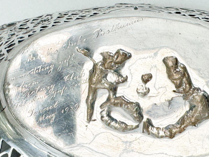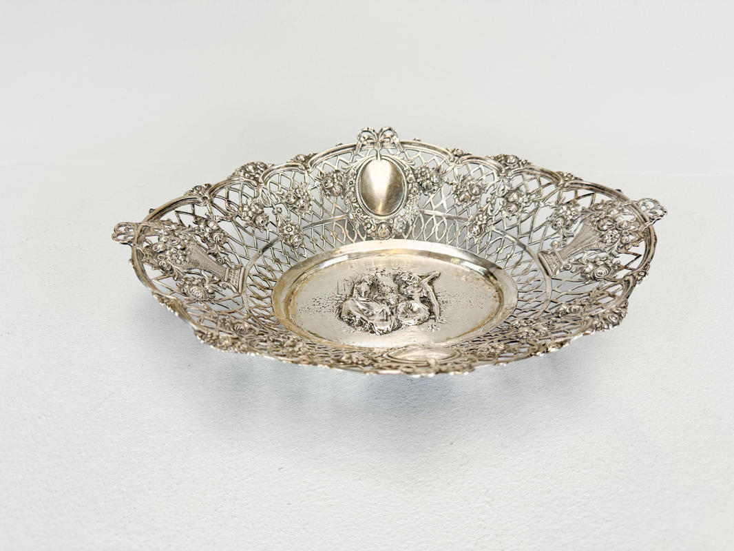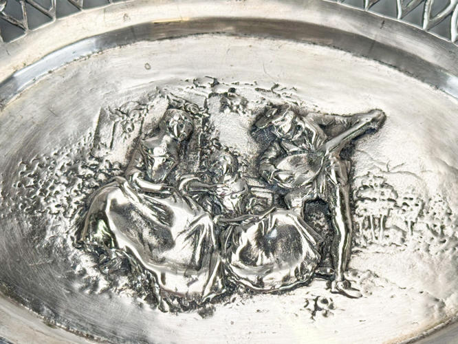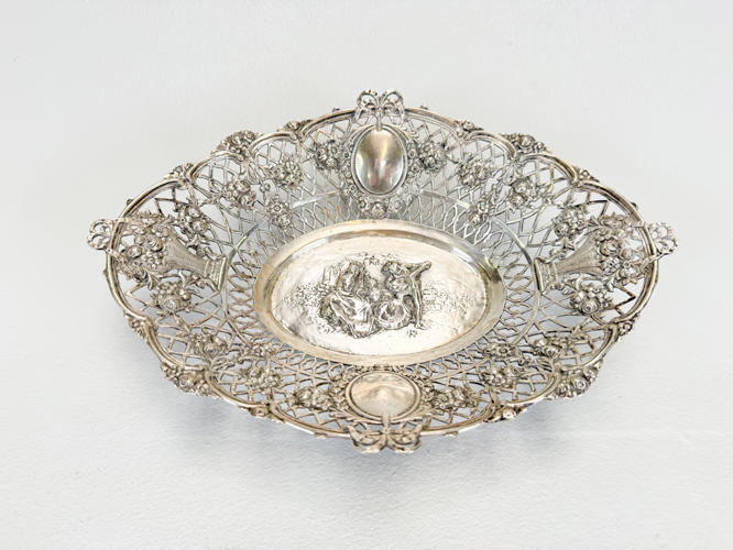Stemplet lødighed 800, prydet med rosetter samt sceneri i relief, l. 30 cm., vægt ca. 498 gr.
