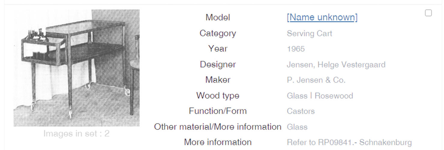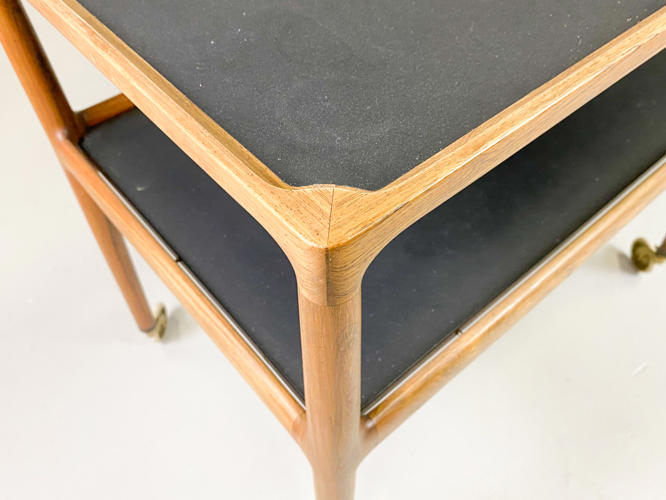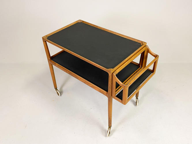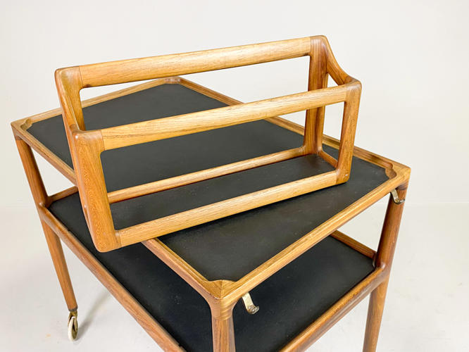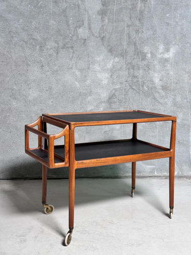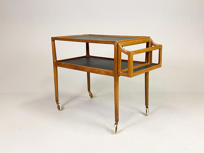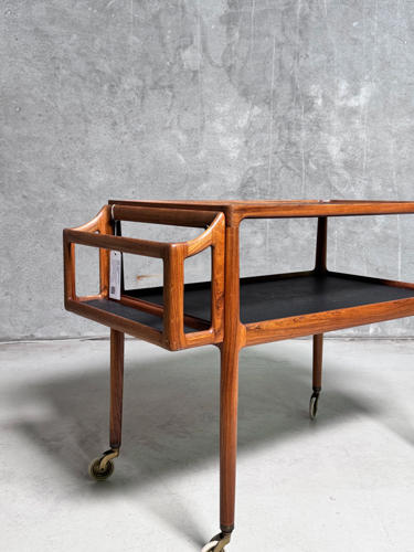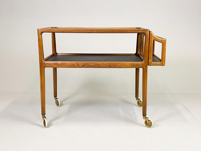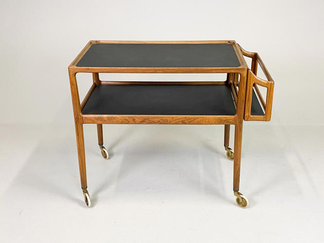 Serveringsvogn af palisander. Top og underhylde med sort formica. Løs flaskebakke med sort formica i bund. Opsat på "sko" og hjul af messing. Tegnet i 1965. Udført hos P. Jensen & Co. 76/88 x 47 x 70 cm. Fremstår i flot stand, dog med lille revne på plade.