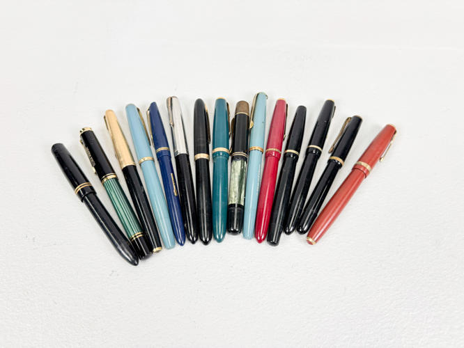 15 Fyldepenne hovedsageligt med spidser af 14 K. guld, stemplet og ikke stemplet, fremstår med defekter samt slid og brugsspor.