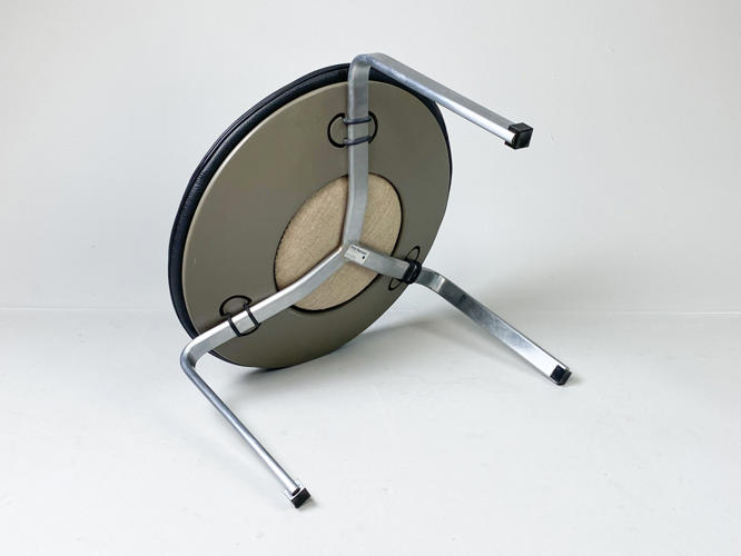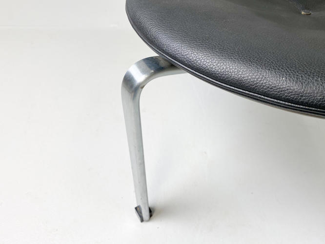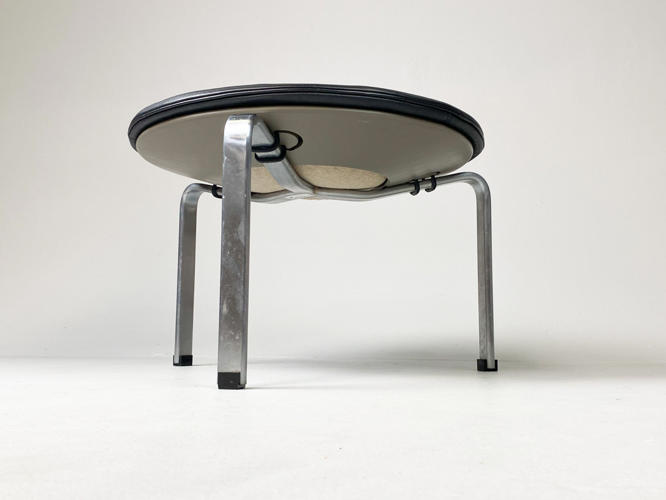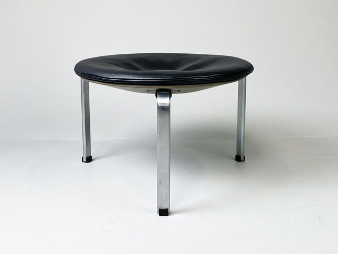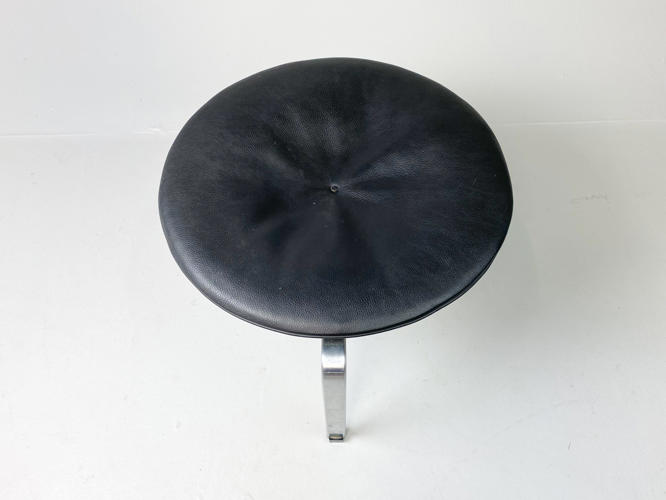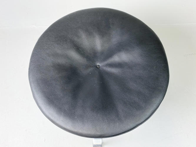 “PK 33”. Skammel med stel af stål. Cirkulær hynde betrukket med sort skind. Formgivet 1958. Udført og mærket hos Fritz Hansen, 2000. Almindelig brugspatina, herunder ridser og mærker. Rust på stel