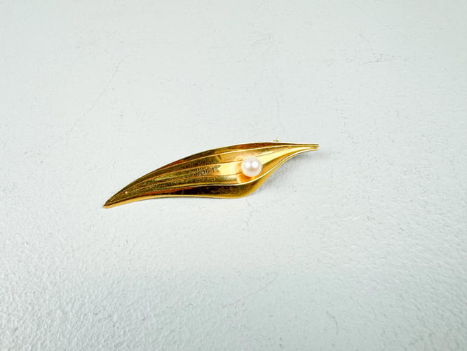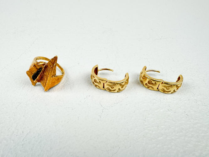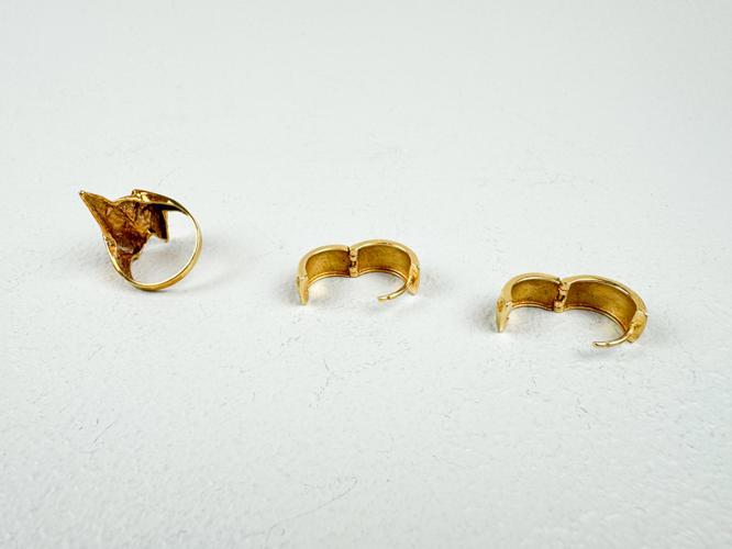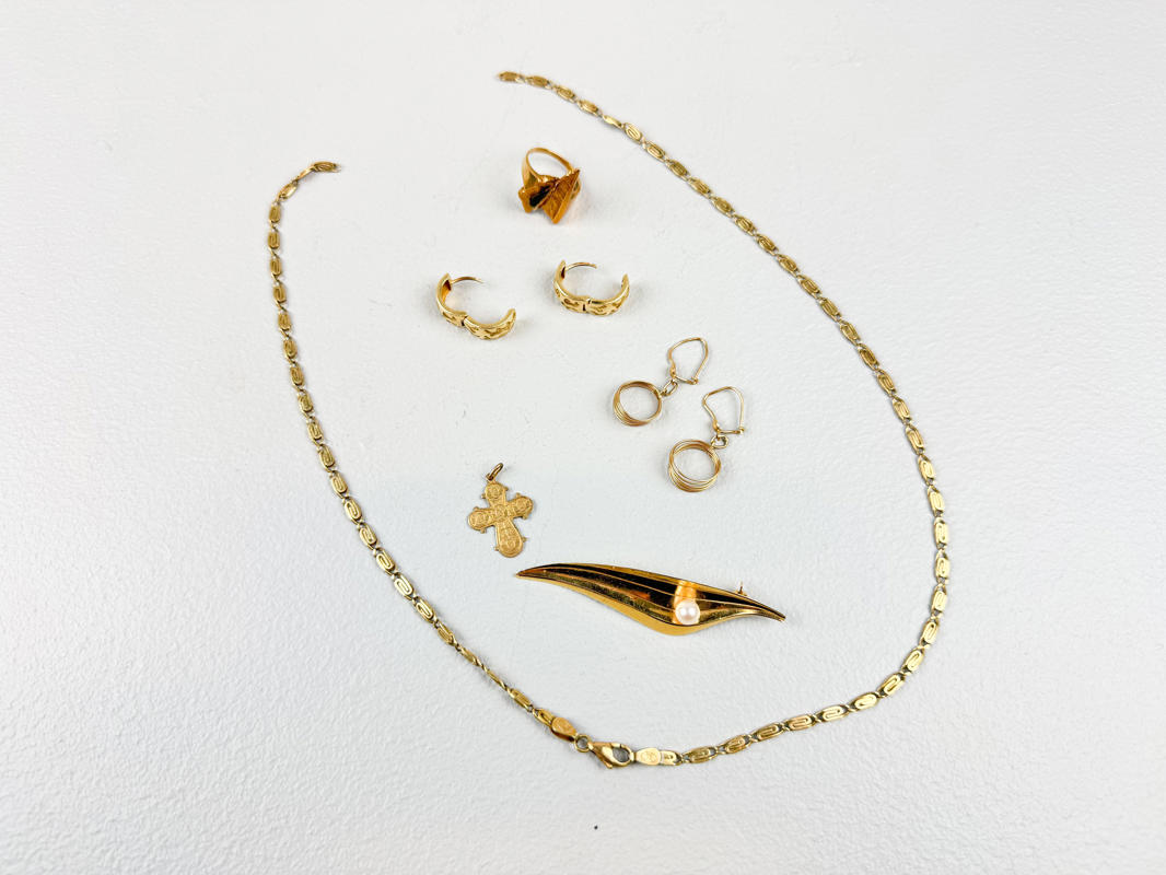 3 ringe (én prydet med ametyster), 2 par øreringe, Dagmarkors, halskæde samt broche prydet med perle. Stemplet 585/14 K. Samlet totalvægt ca. 39,9 g.