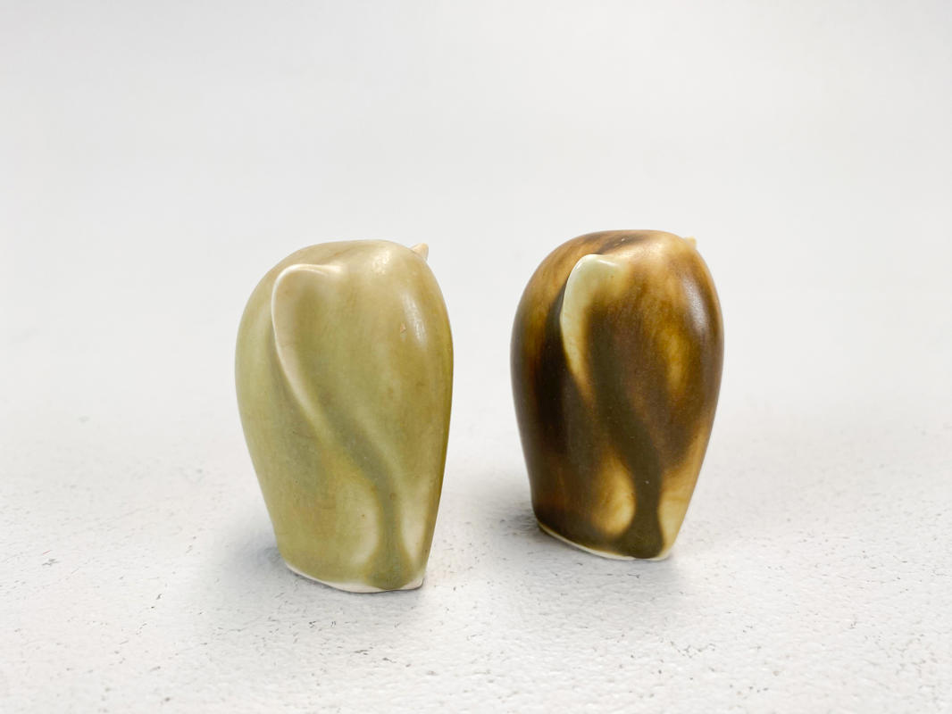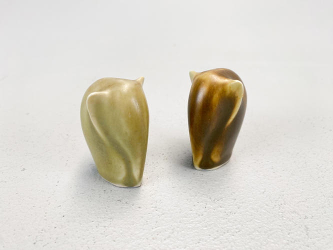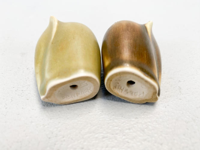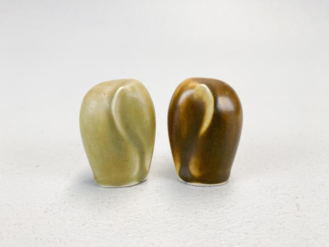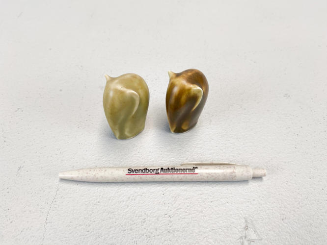 2 elefanter af stentøj. Dekoreret med grønlig og brunlig glasur. Signeret KJ. H. 5 cm.