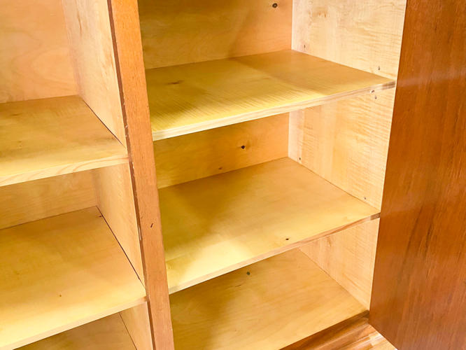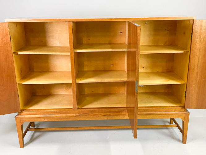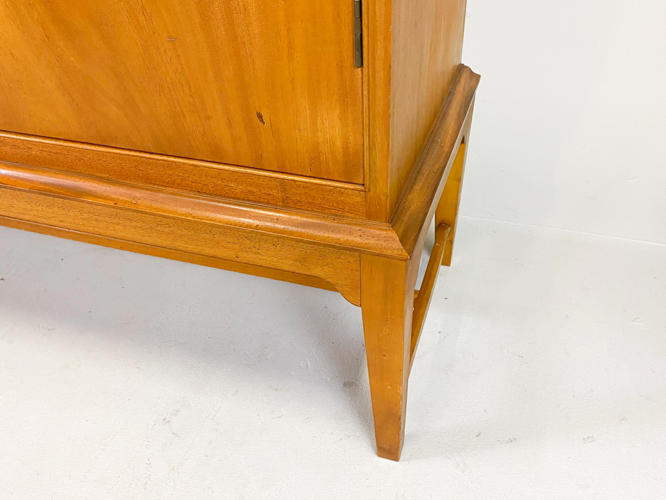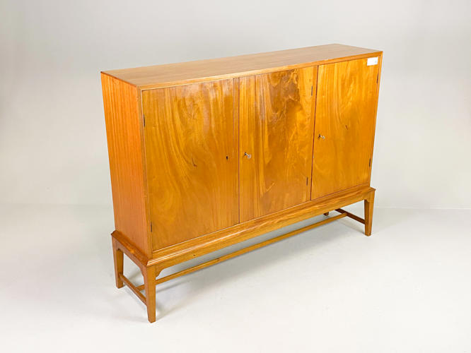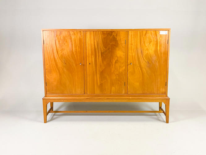 Dækketøjsskab af mahogni. Front med 3 låger bag hvilke diverse hylder. 165 x 43 x 122 cm. Fremstår med brugsspor, ridser og mærker.