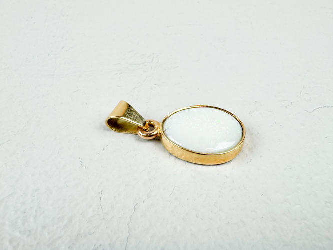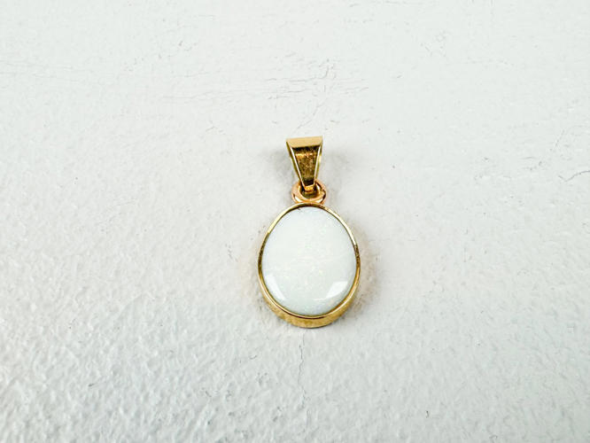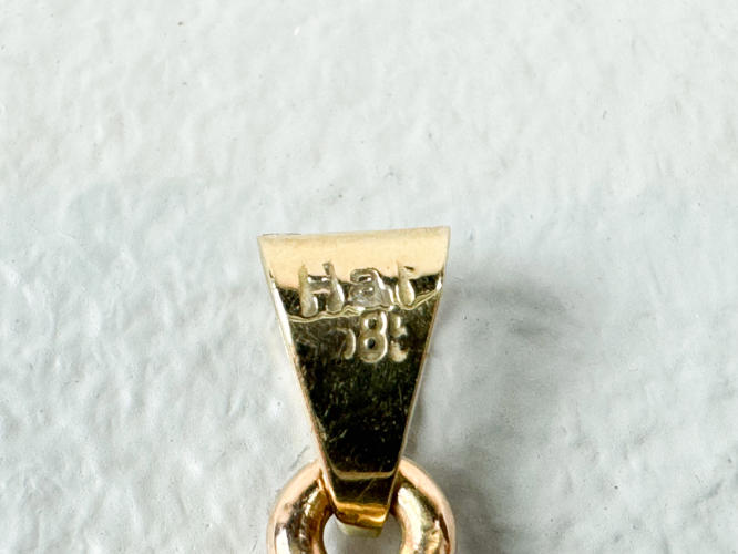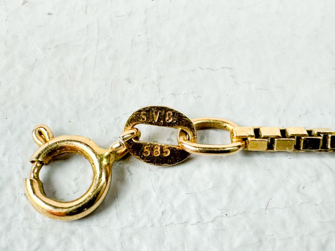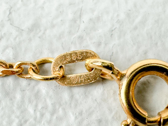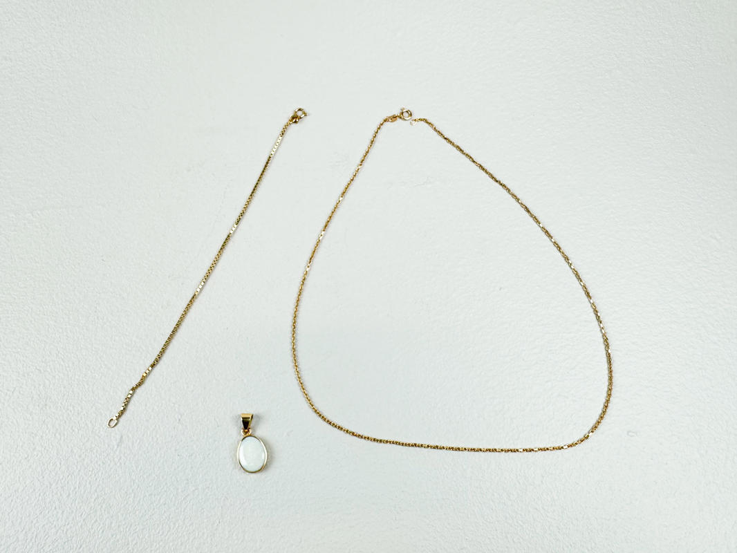 Halskæde samt armlænke af 14 kt. stemplet 585, l. 18,5 - 50 cm., samlet vægt ca. 7,7 gr., vedhæng af guld stemplet 585, prydet med oval månesten, totalvægt ca. 2,6 gr.
