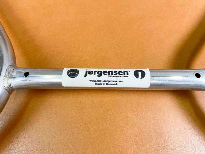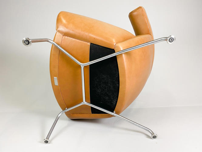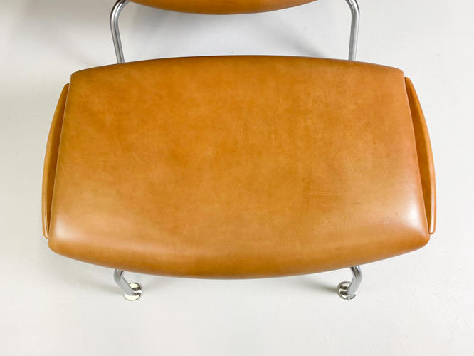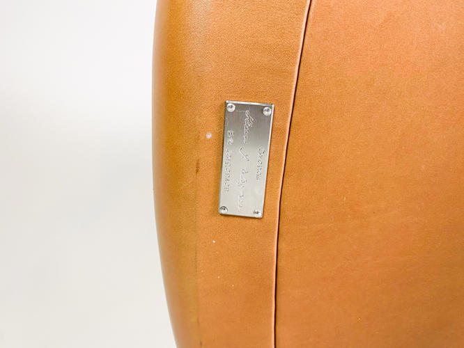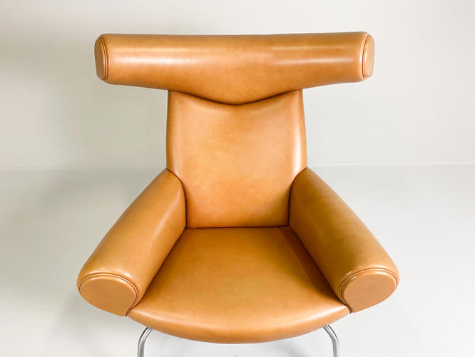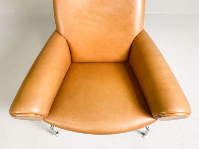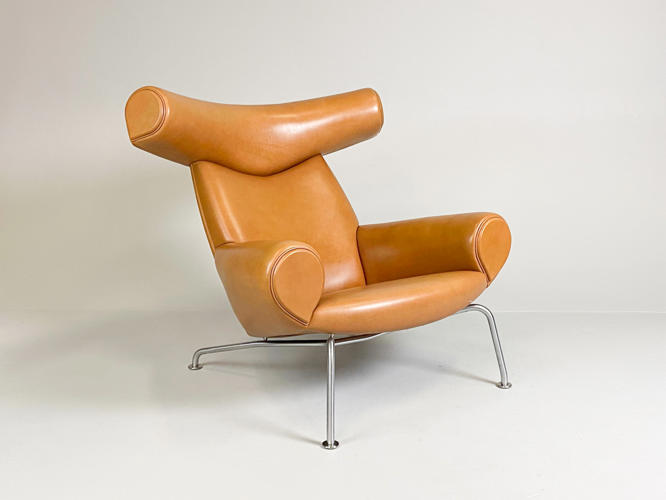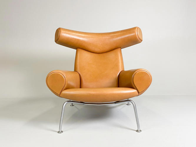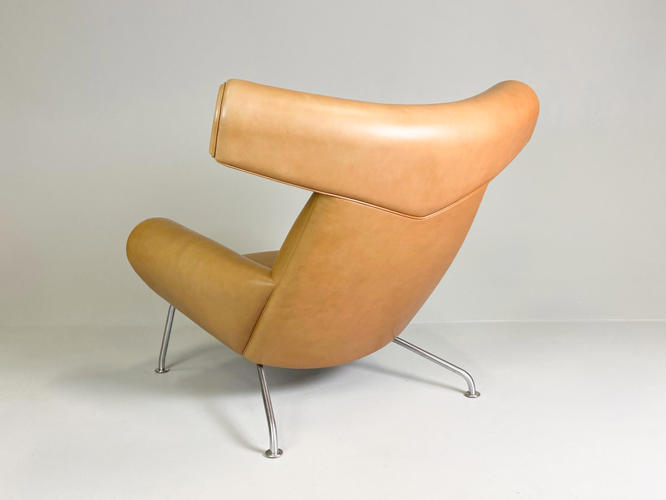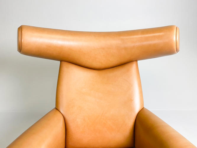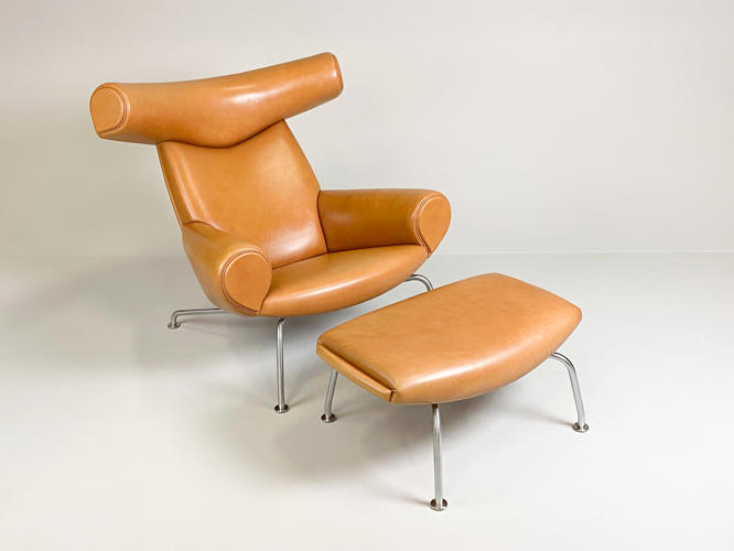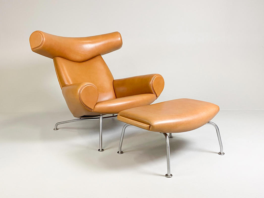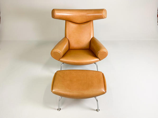 “Ox Chair/Pøllestolen”. Hvilestol samt skammel med stel af stål, sider, sæde og ryg betrukket med cognacfarvet skind. Model EJ-100. Designet 1960. Udført hos Erik Jørgensen med plakette herfra under stol samt mærkat under skammel.