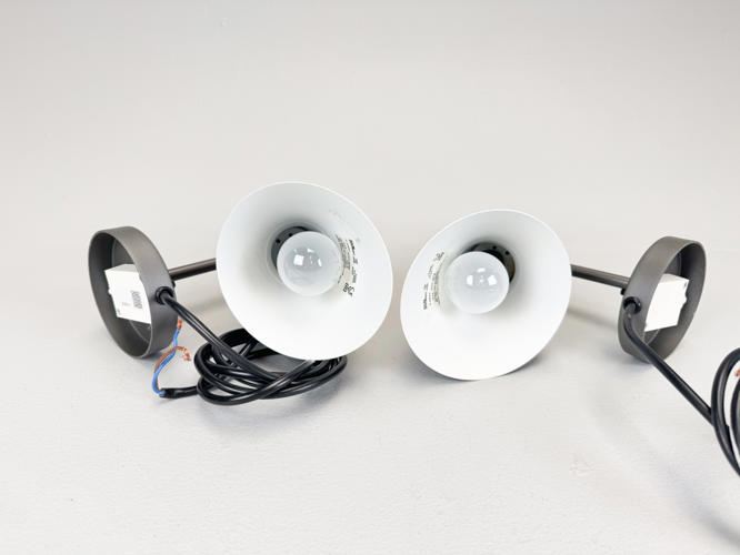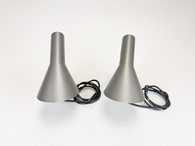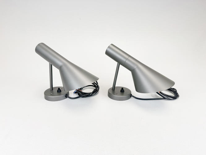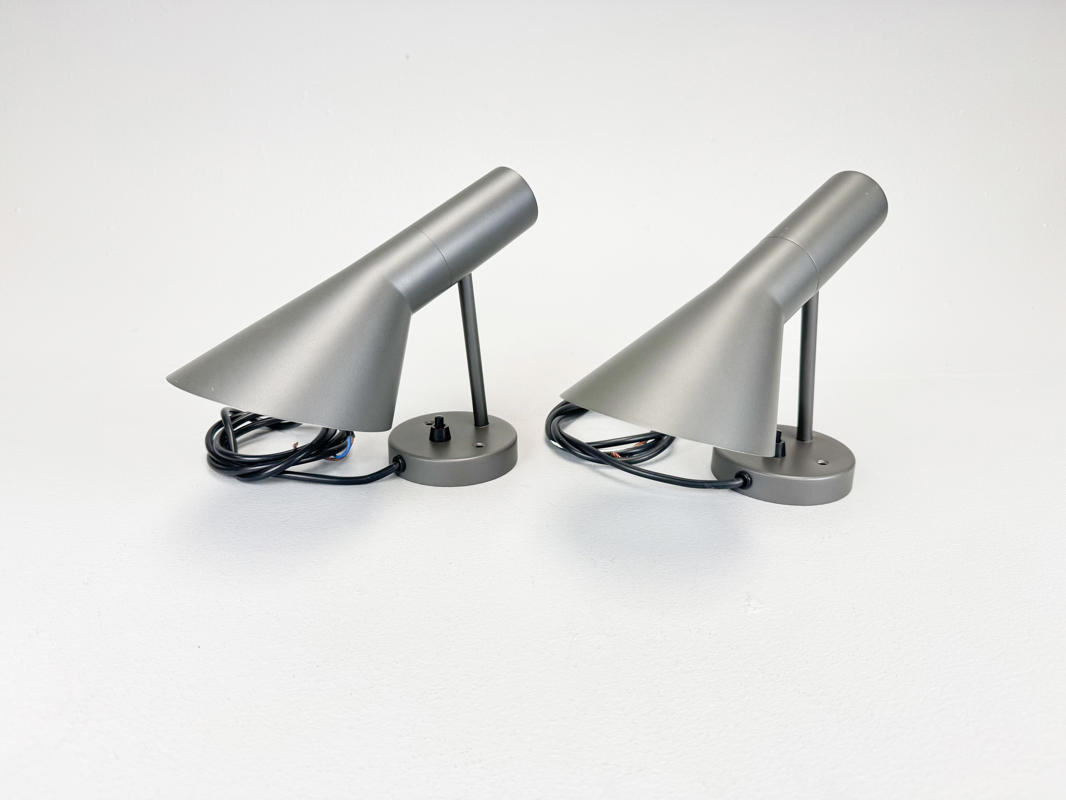 Par AJ væglamper af grålakeret lakeret metal. Formgivet i 1957. Fremstillet hos Louis Poulsen, model AJ-væg. H. 18 cm. D. 31,8 cm., fremstår med enkelte brugsspor i form af ridser.