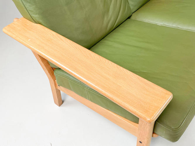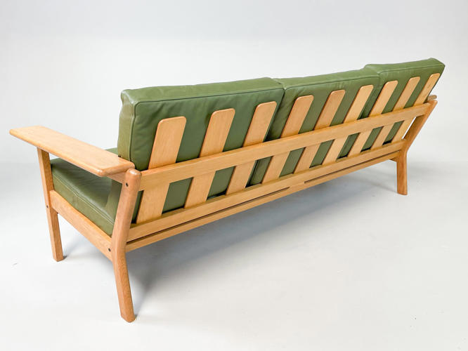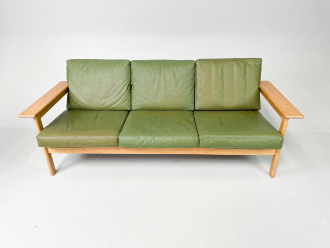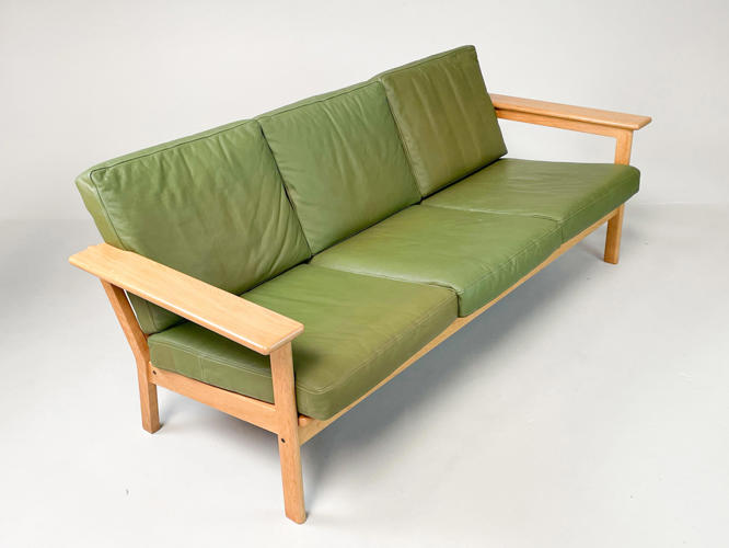 Fritstående 3-personers sofa med stel af egetræ, hynder betrukket med grønt indfarvet skind, l. 185 cm. Enkelte små pletter på armlæn samt lette brugsspor.
