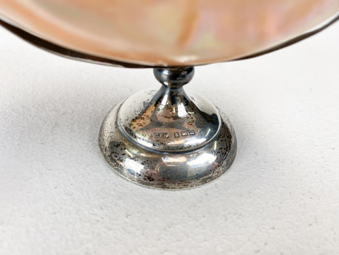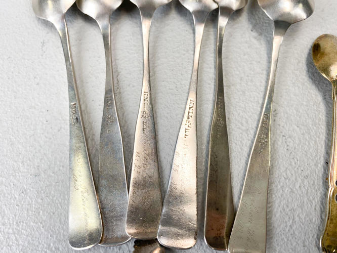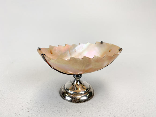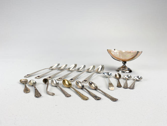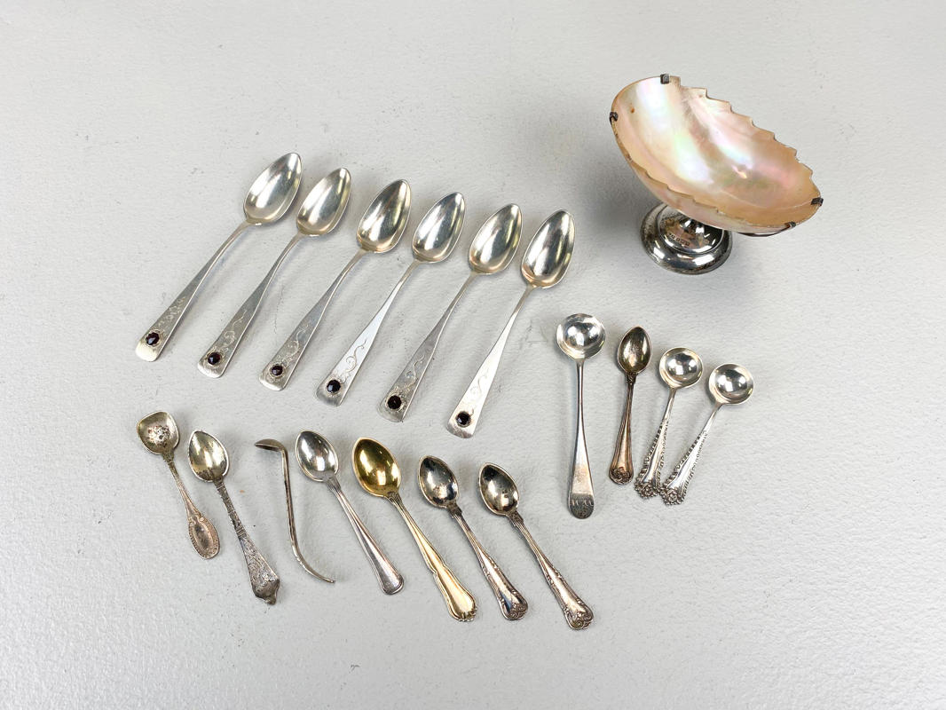 Engelsk saltkar af sterlingsølv og musling, 6 teskeer prydet med granat samt 11 saltskeer. Sølv og sterlingsølv, 830 og 925. Totalvægt uden saltkar ca. 108,5 g.