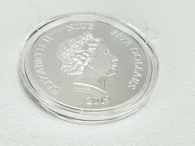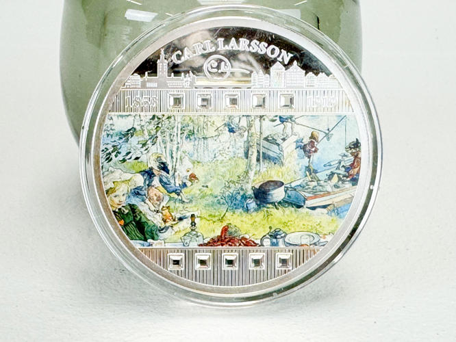 Elisabeth II 5 Dollars. 2019. Af Finsølv .999. "Krebsefiskeri". Udført i forbindelse med Carl Larssons 100-års dødsdag. Diam. 65 mm. Vægt 93,3 g.
