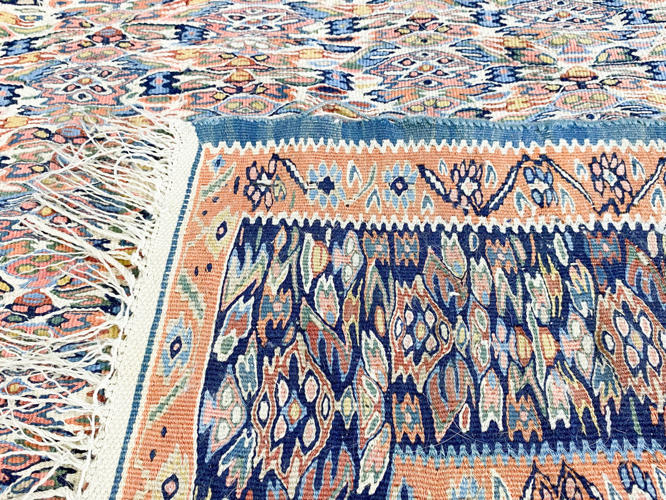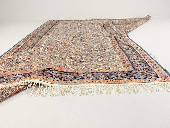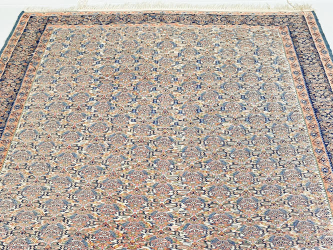 Semi-antik. Lys bund med røde og blå farver. 232 x 160 cm.