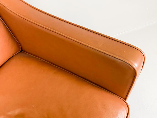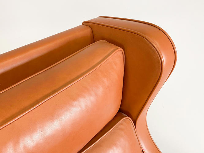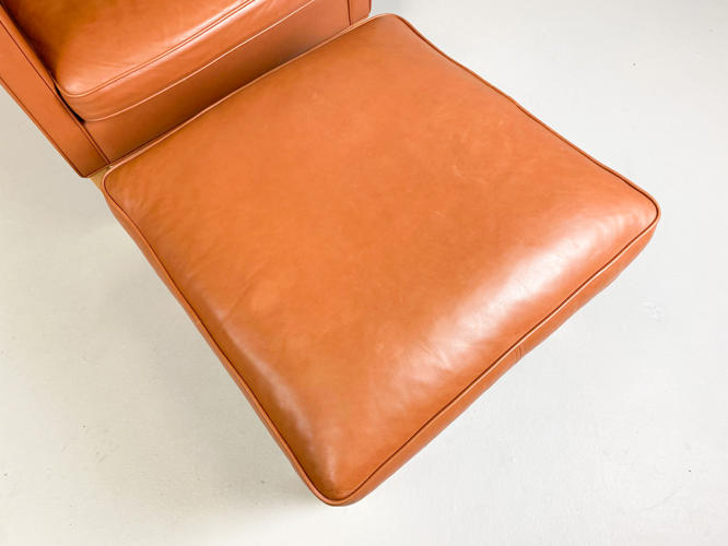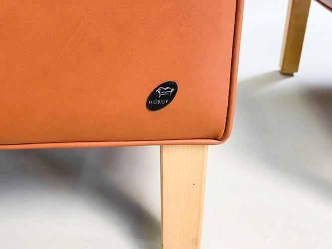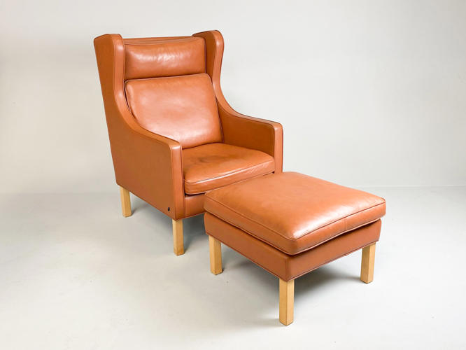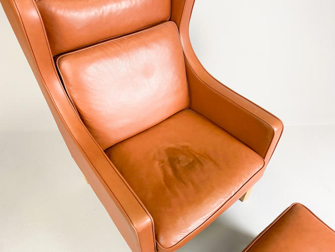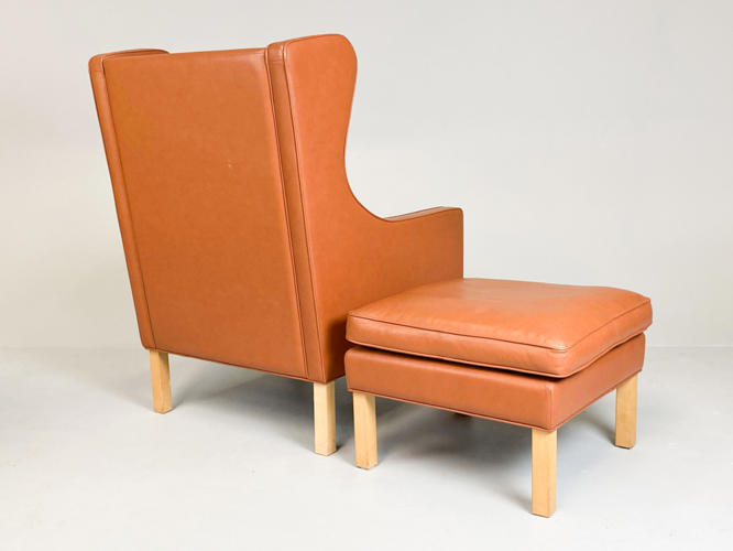 Øreklap lænestol med fodskammel, betræk af brunt skind, ben af bøgetræ, fremstår med enkelte brugsspor samt let slid.