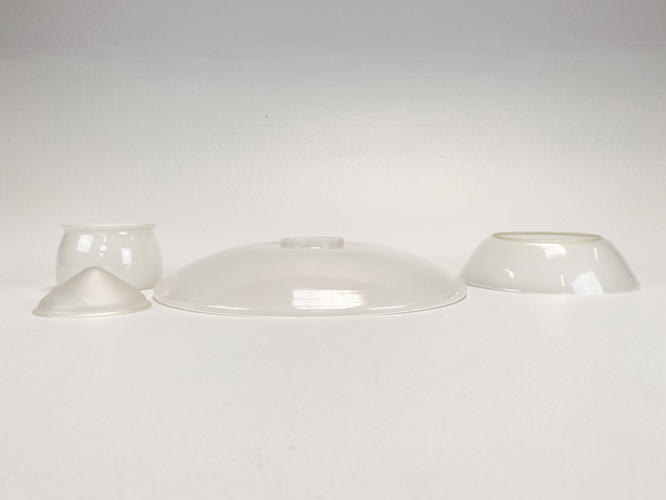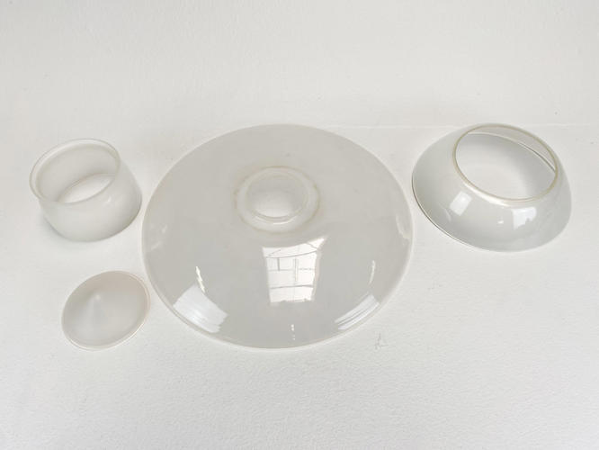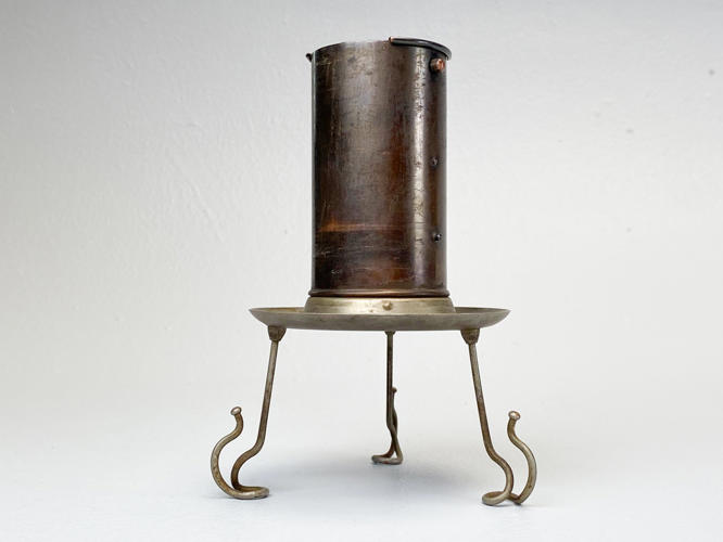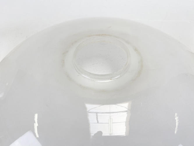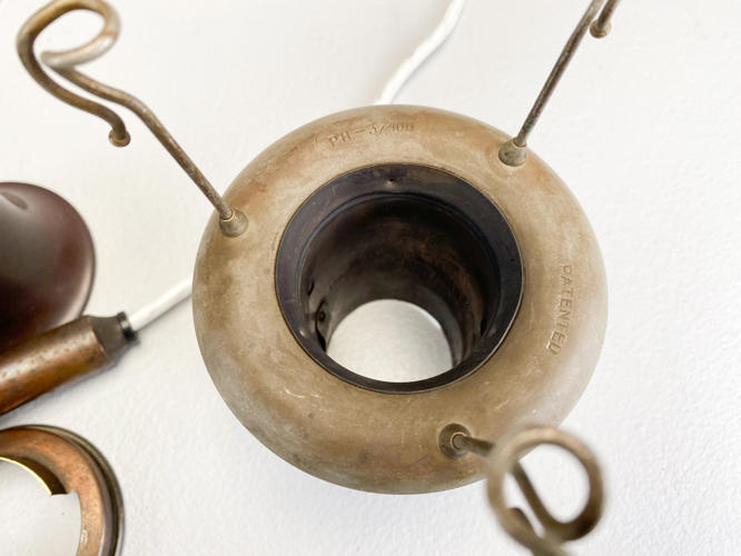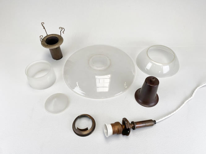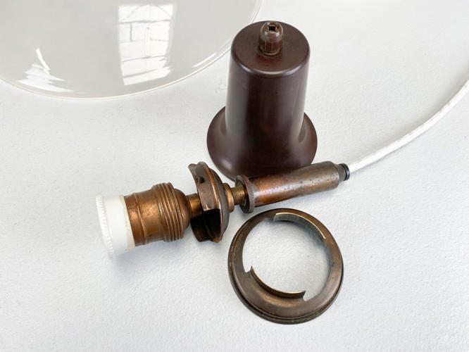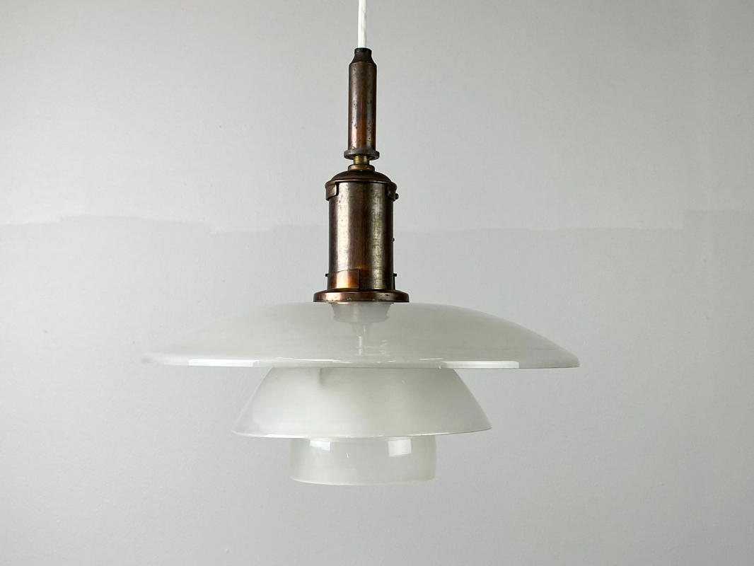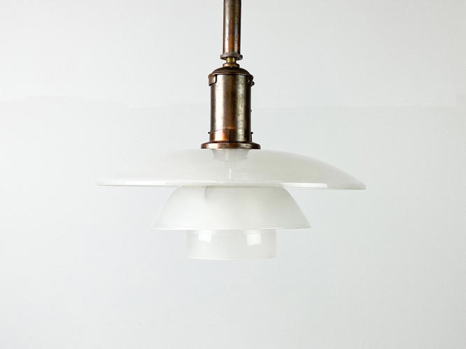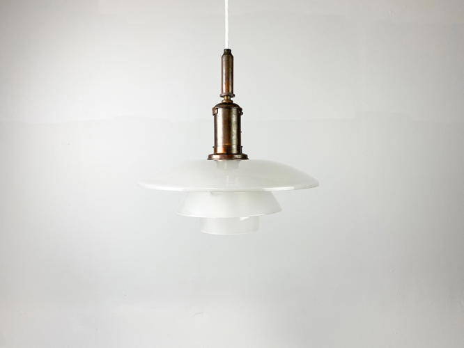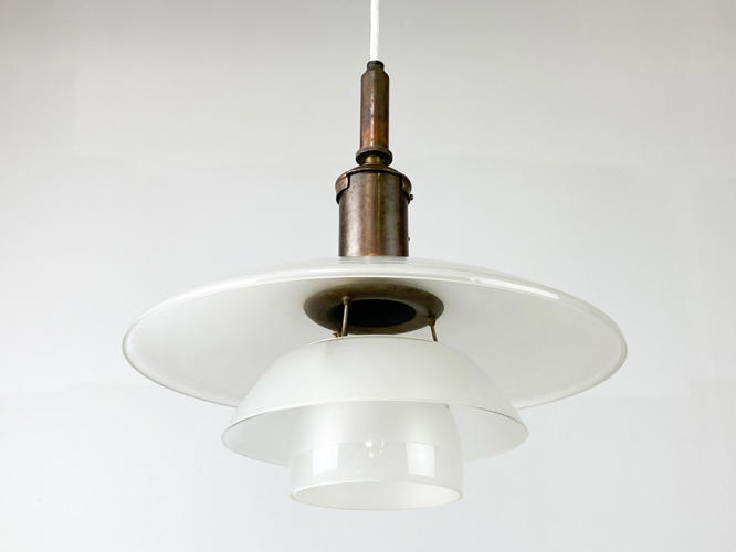 PH 3,5/3 loftsbelysning med matteret skærmsæt og fatningshus af bruneret messing. Skærmophæng med trådben. Stemplet "PH 3/100" "PATENDED". Produceret hos Louis Poulsen i 1930'erne. Diam. 33 cm. Fremstår med små aldersrelaterede kantafslag på O- og M-skærm.