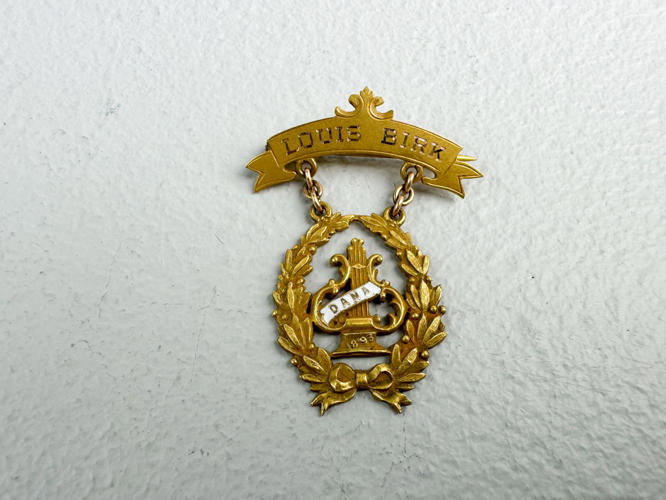 Præget "Louis Birk", DANA 1893 på front. Bagside stemplet "solid gold" Jan. 8, 1916. 45 x 33 mm. Totalvægt ca. 7,4 g.