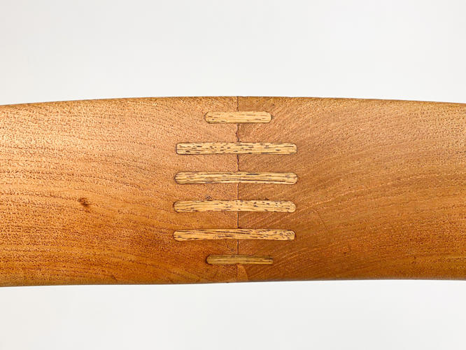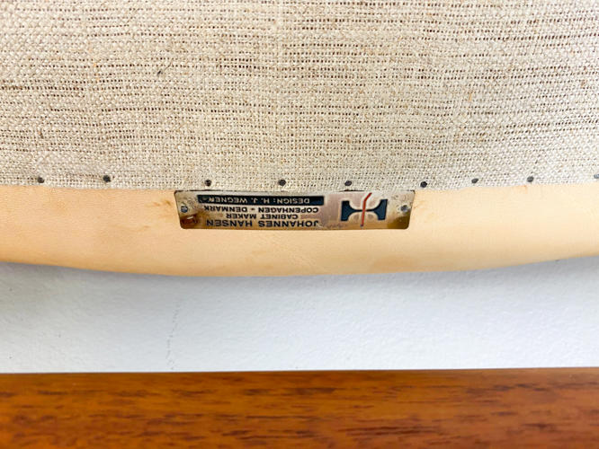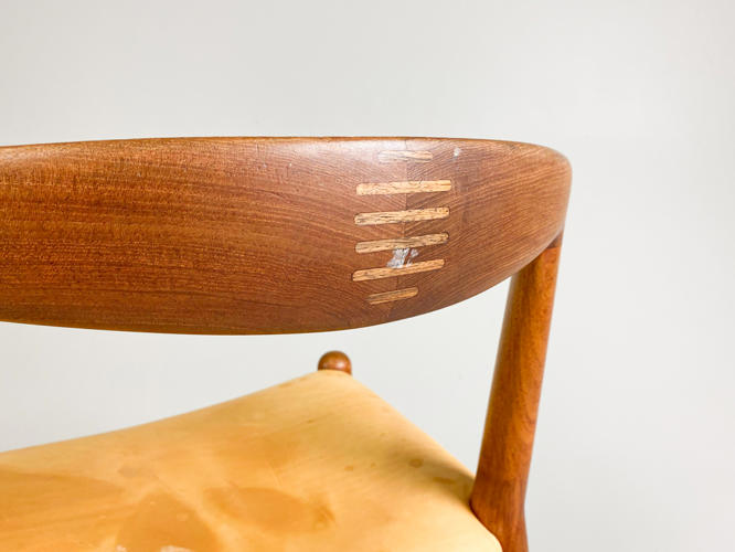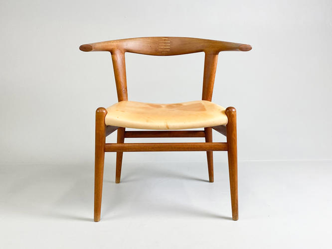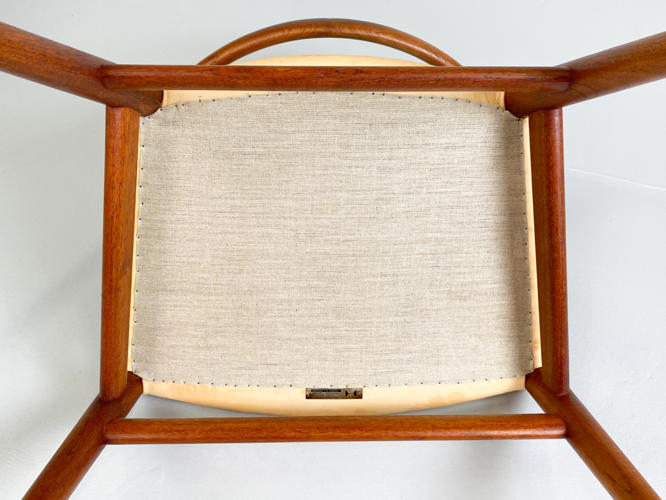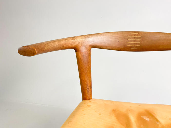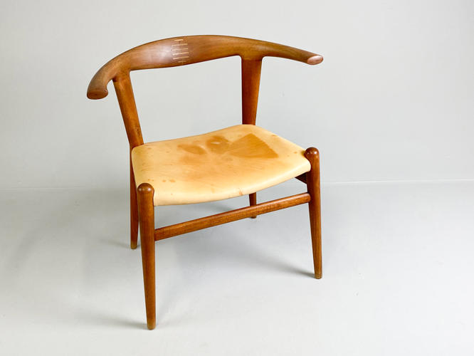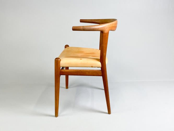 “Tyrestolen”. Armstol af massiv teak, indlægninger i ryg. Sæde betrukket med originalt naturskind. Model JH 518. Formgivet 1961. Udført hos snedkermester Johannes Hansen, med plakette herfra. Model præsenteret på Københavns Snedkerlaugs Møbeludstilling på Kunstindustrimuseet 1961.