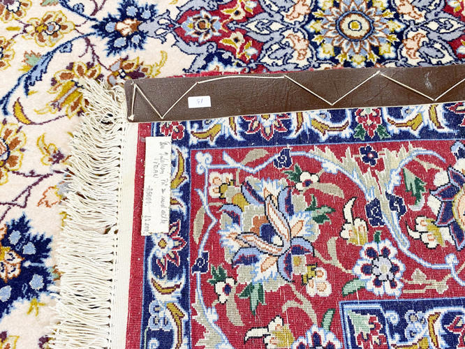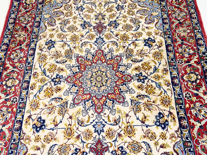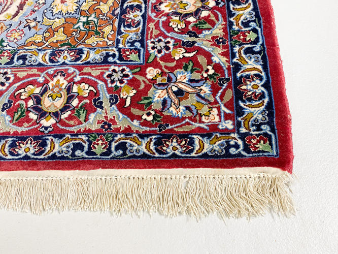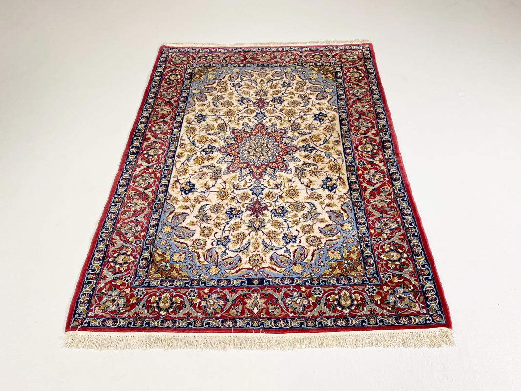 Semi-antik tæppe. Lys bund med center medaljon. Rød bort med blomsterdekoration. 165 x 112 cm.