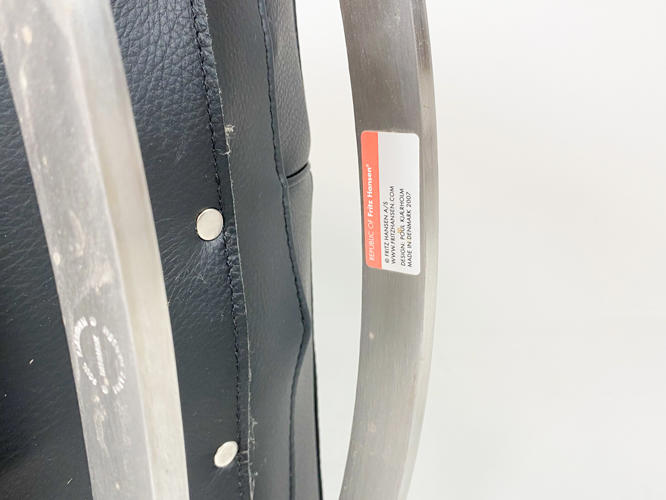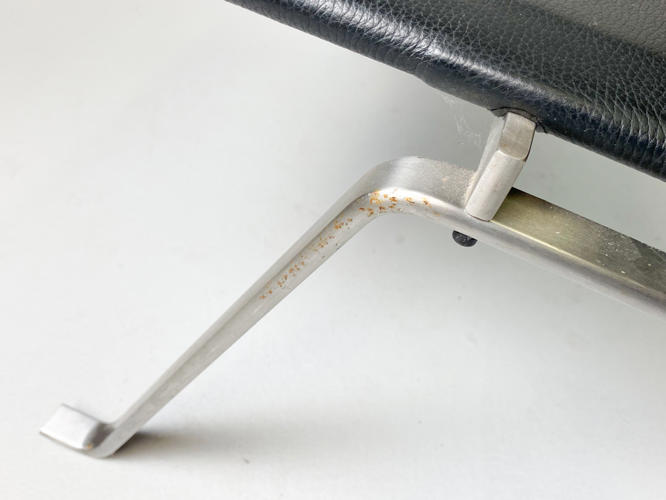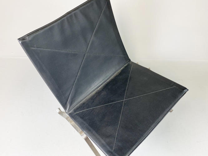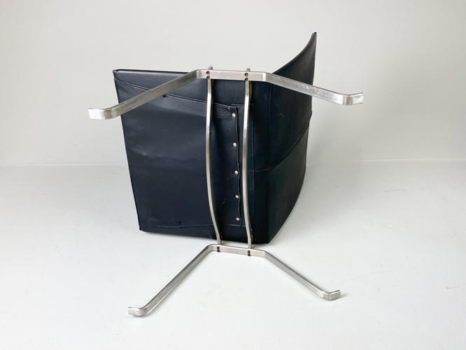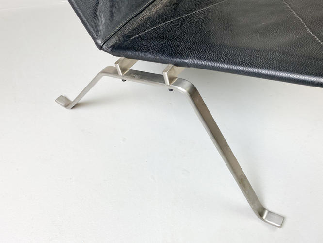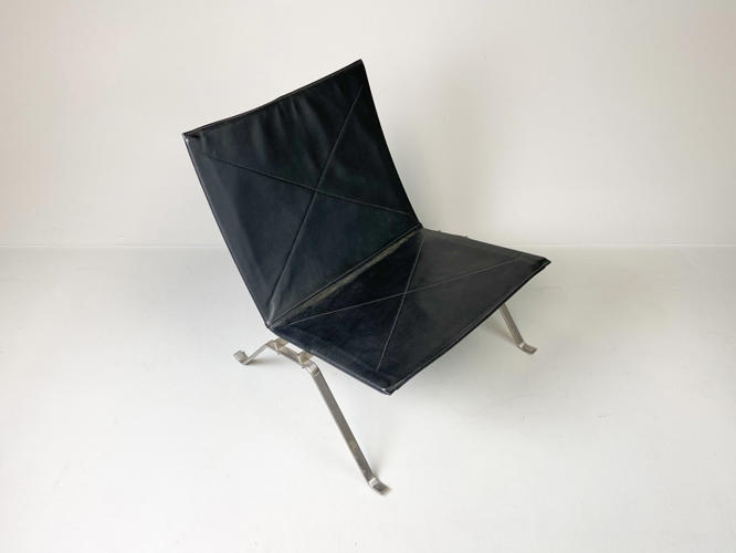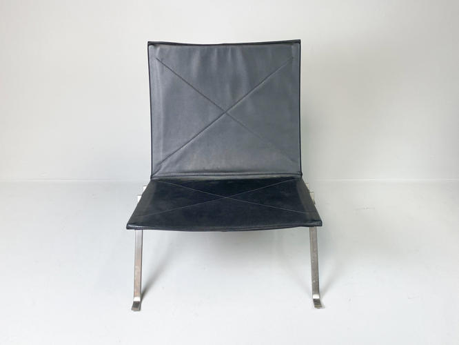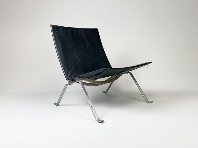 “PK 22”. Lænestol med stel af stål. Sæde og ryg betrukket med sort skind. Formgivet 1956. Udført og mærket hos Fritz Hansen, 2007. Almindelig brugspatina, herunder ridser og mærker. Rust på stel