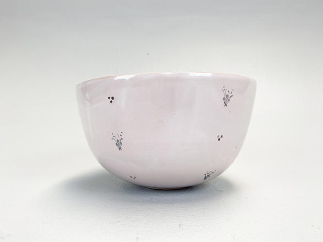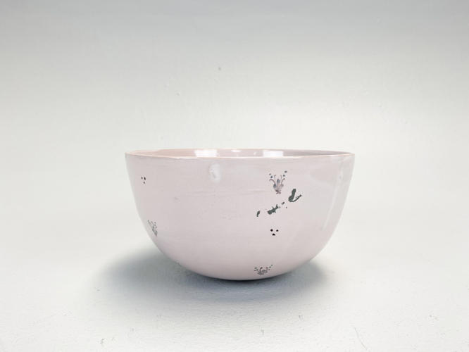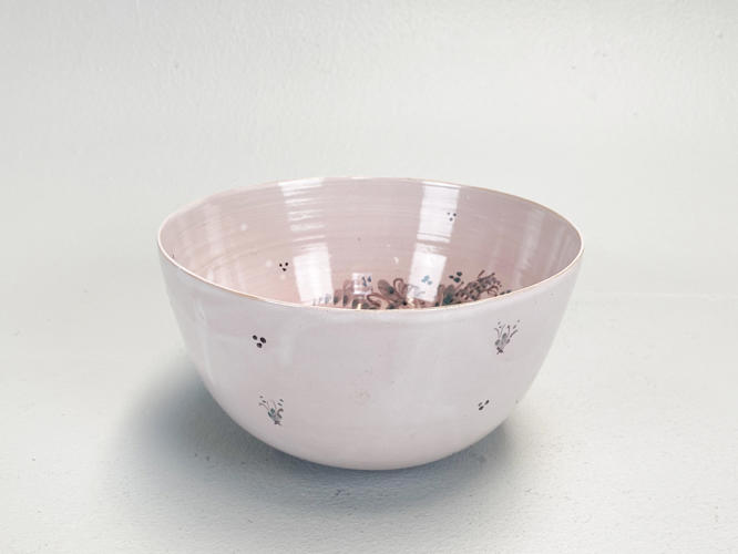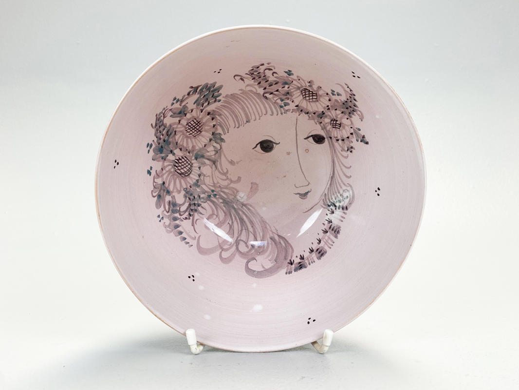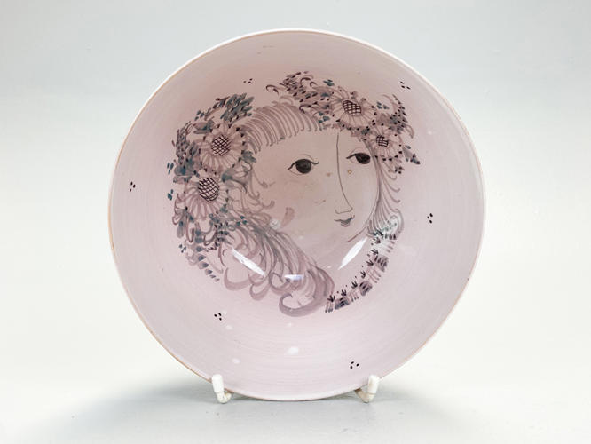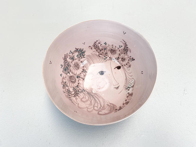 Skål af lertøj. Dekoreret med lyserød glasur. Indvendig med kvindeansigt. Ydersiden med blomsterdekorationer. Signeret Bjørn Wiinblad 1951 samt med ansigt i bund, nr. 43. Unika. H. 10,5 cm. Diam. 19,5 cm.