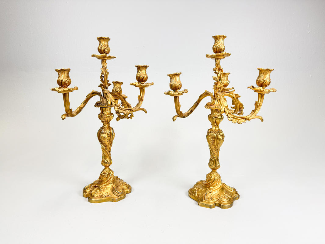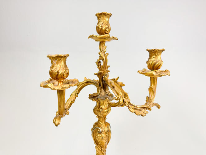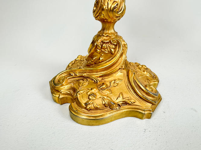 Bronzeret zink, rigt udsmykket med bladværk og roccailer, h. 49 cm., fremstår med slid.