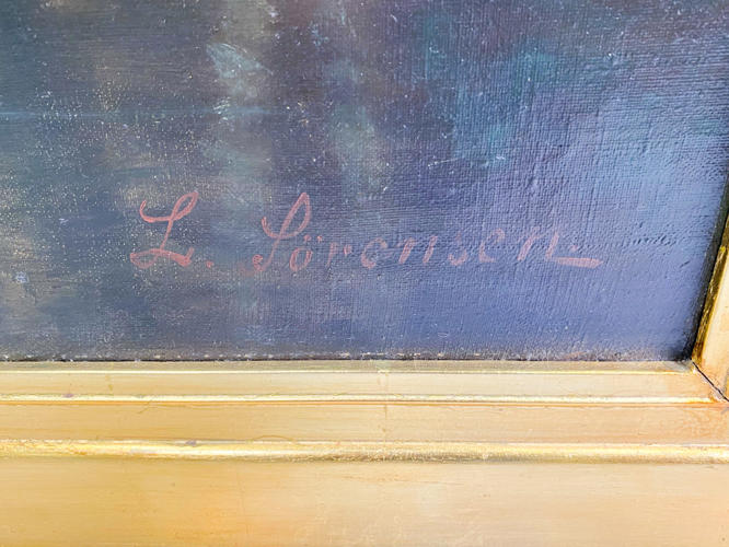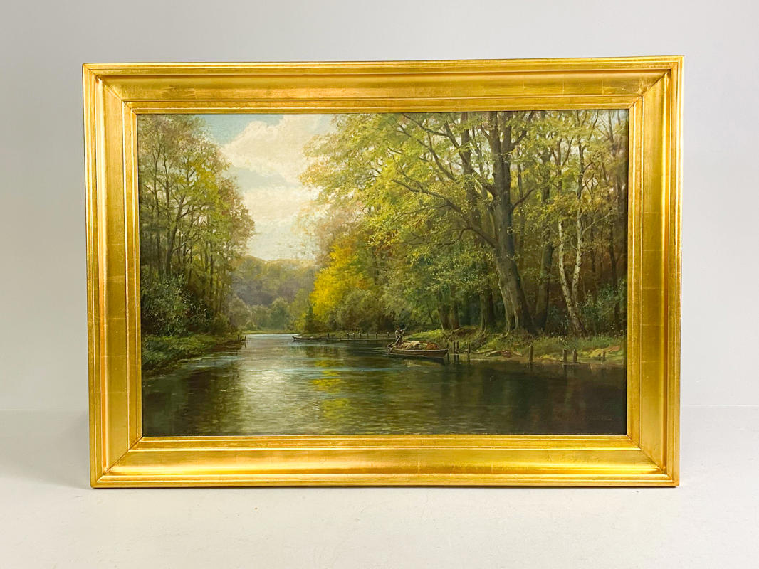 Sejlende igennem skoven, olie på lærred, signeret L. Sørensen, i pragtramme, 81 x 120