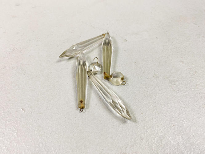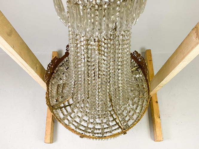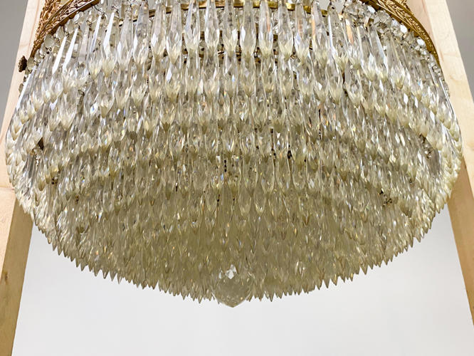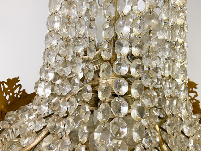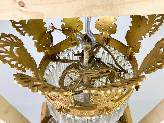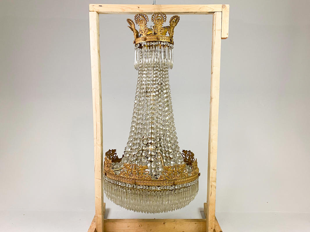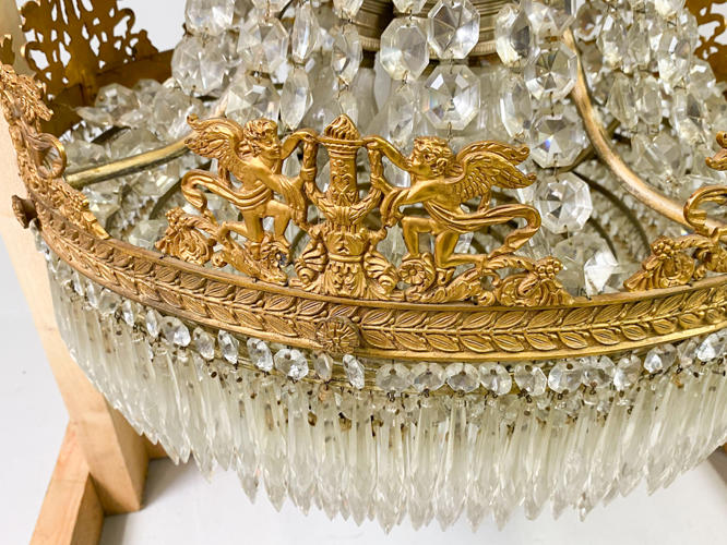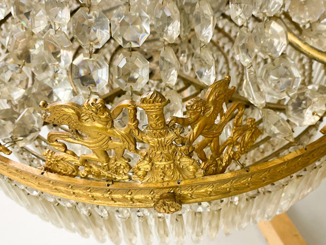 Empireformet prismekrone af forgyldt messing. Rigt dekoreret med puttier, bladværk og talrige prismer. Diam. 58 cm. H. 115 cm. Enkelte prismer mangler samt én putto med defekt.