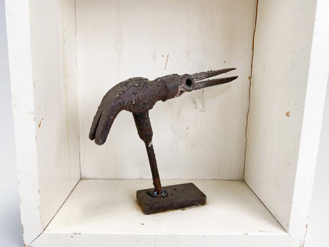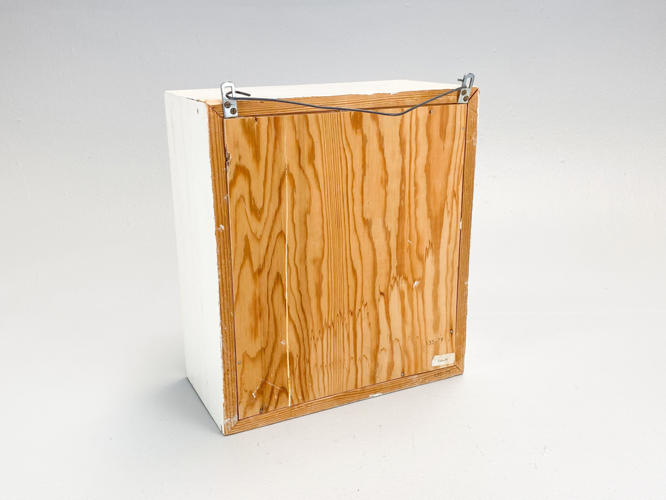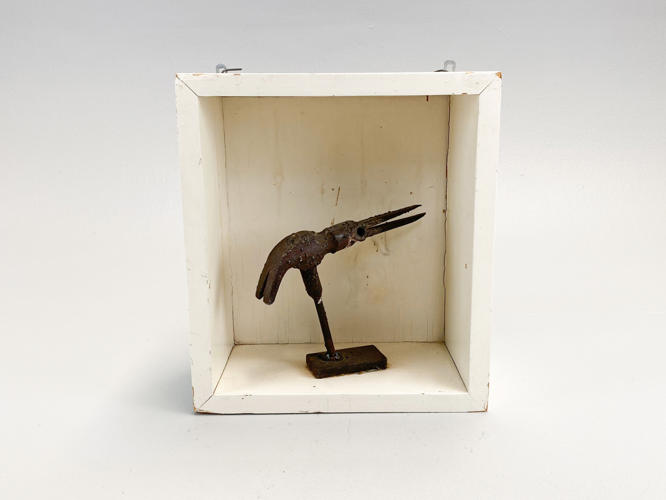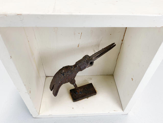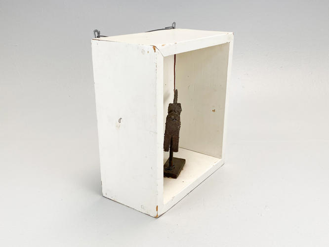"Hiroglyf". Patineret jern. H. 18 cm. Indsat i væghængt ramme/hylde af hvidmalet træ. 32x28x15 cm. Auktion over kunstværker og kunstgenstande fra Odense Kommune.