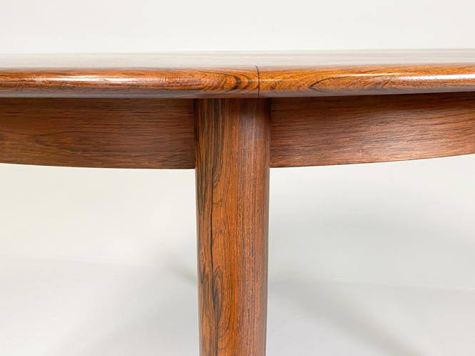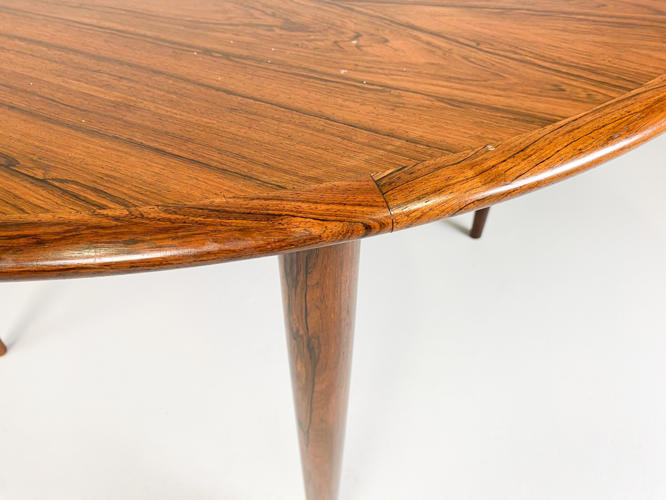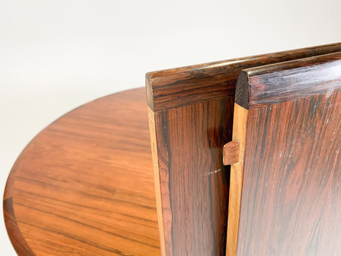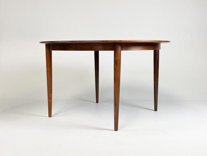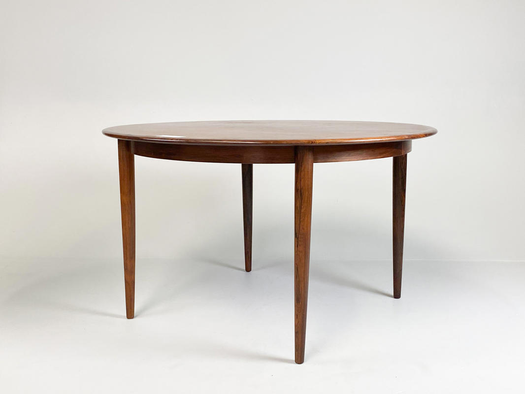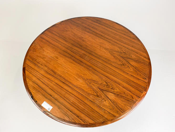 Rundt spisebord af palisander. Med udtræk og tillægsplader. Diam. 125 cm. H. 72,5 cm.