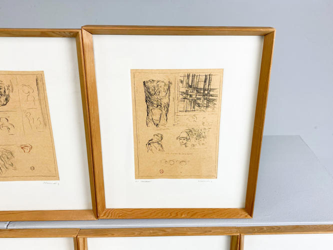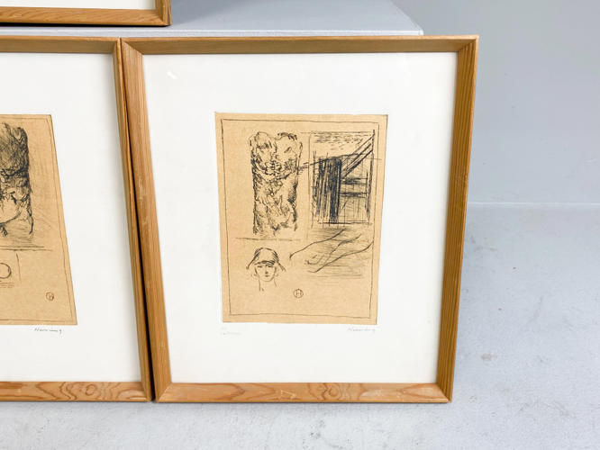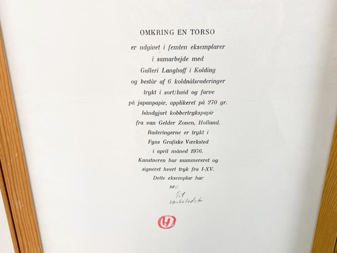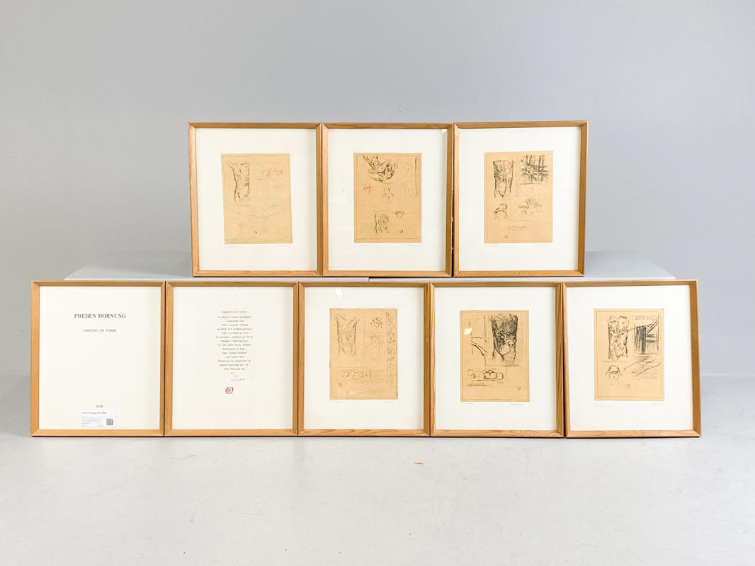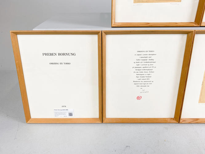 “Omkring en torso”. Alle signeret "Hornung, "Til Værkstedet". 6 koldnålsraderinger i farver samt forside og vers. Bladstørrelse hver 38×32. Auktion over kunstværker og kunstgenstande fra Odense Kommune.