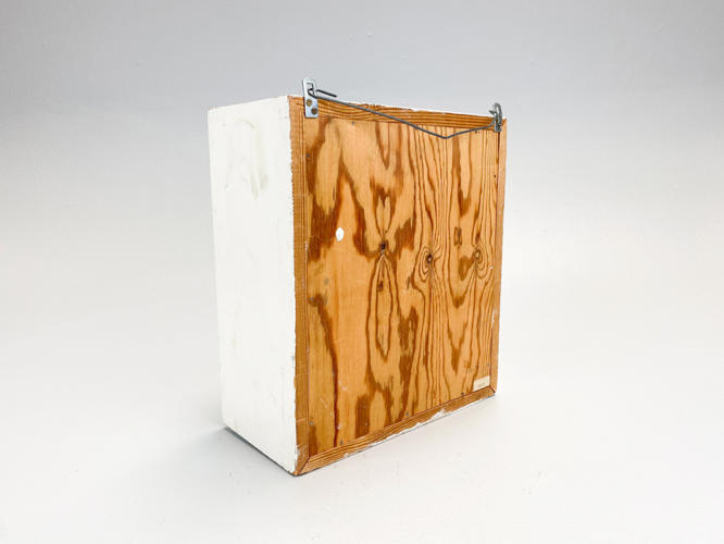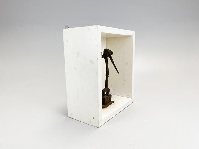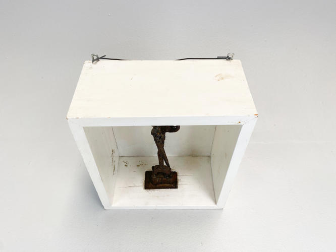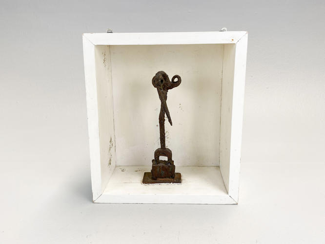 "Havgud". Patineret jern. H. 24 cm. Indsat i væghængt ramme/hylde af hvidmalet træ. 32x28x15 cm. Auktion over kunstværker og kunstgenstande fra Odense Kommune.