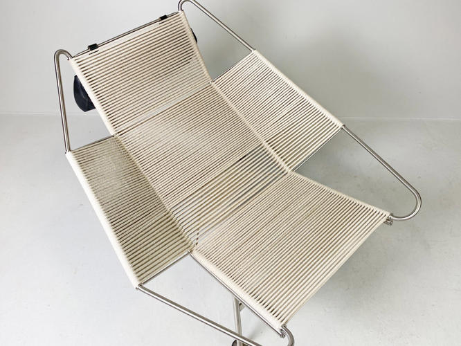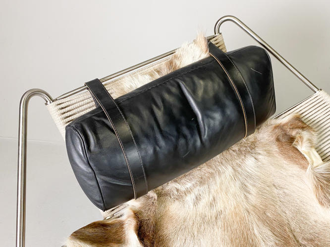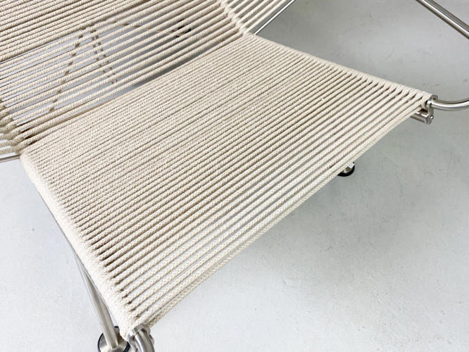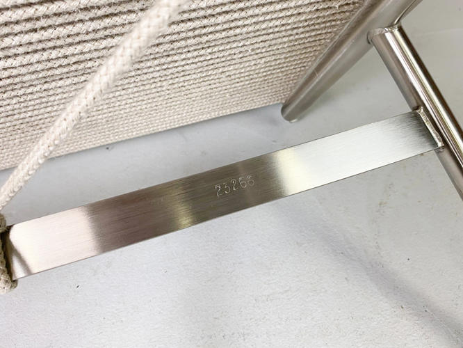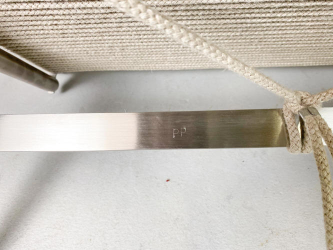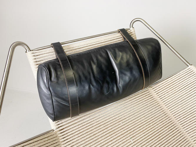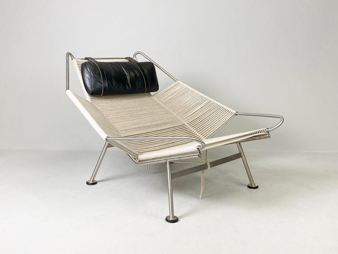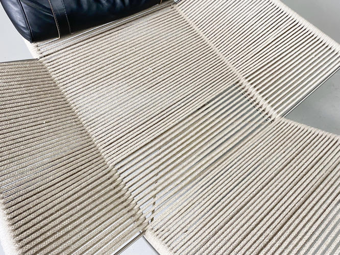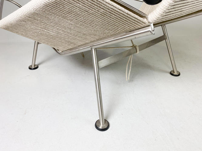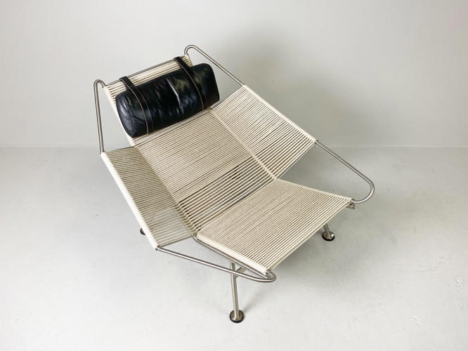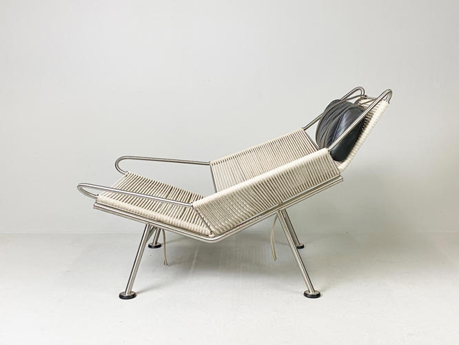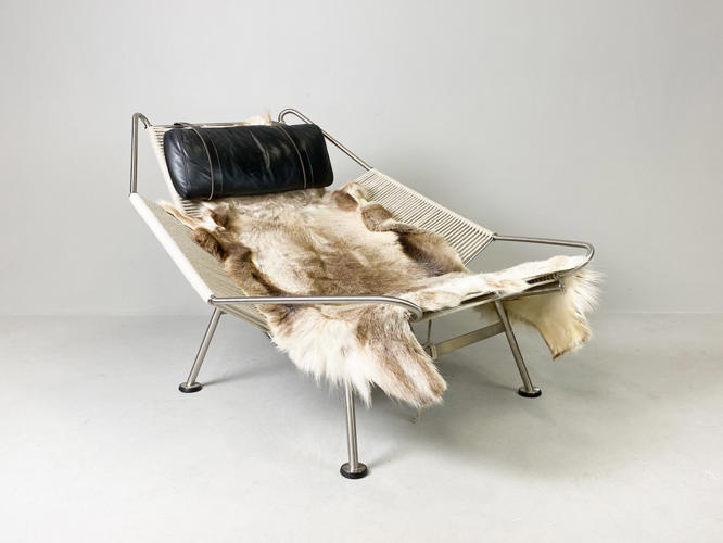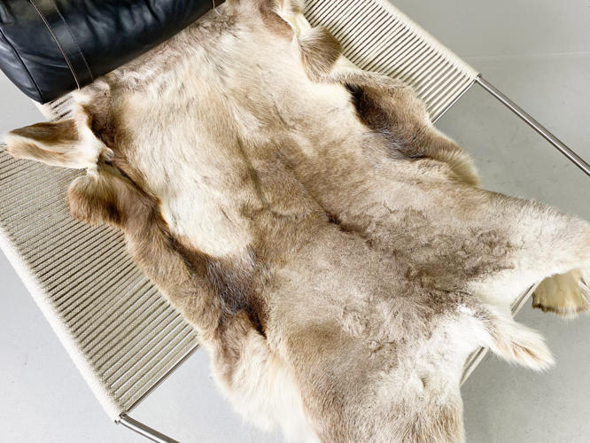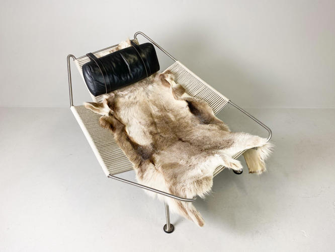“Flaglinestolen”. Lænestol af stål. Sæde, sider og ryg med naturfarvet flagline. Nakkepude betrukket med sort skind. Model PP 225. Formgivet 1950. Udført og mærket hos PP Møbler. Nr. 23266. Løst rensdyrskind medfølger.