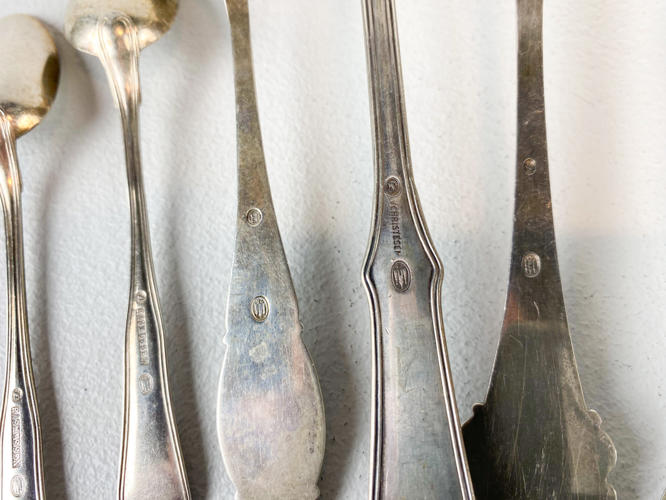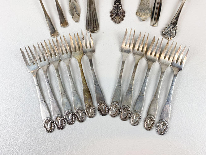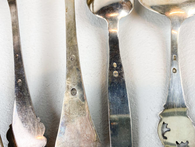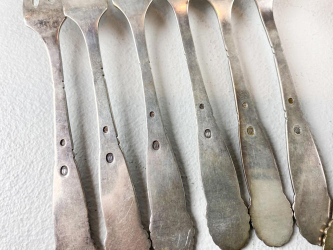 8 Diverse skeer samt 11 kagegafler af sølv, stemplet med tre-tårne, totalvægt ca. 522 gr., dele med gravering samt slid