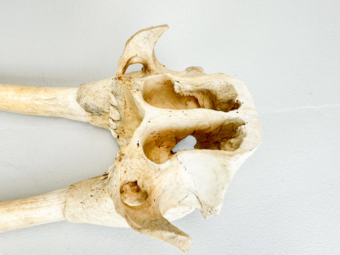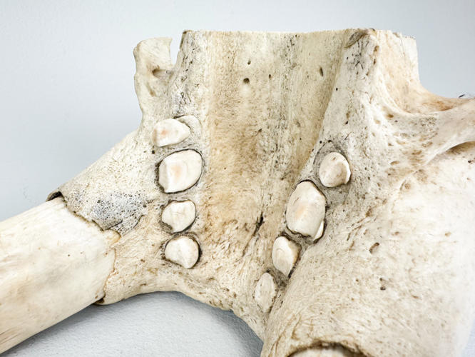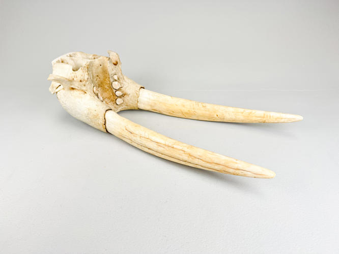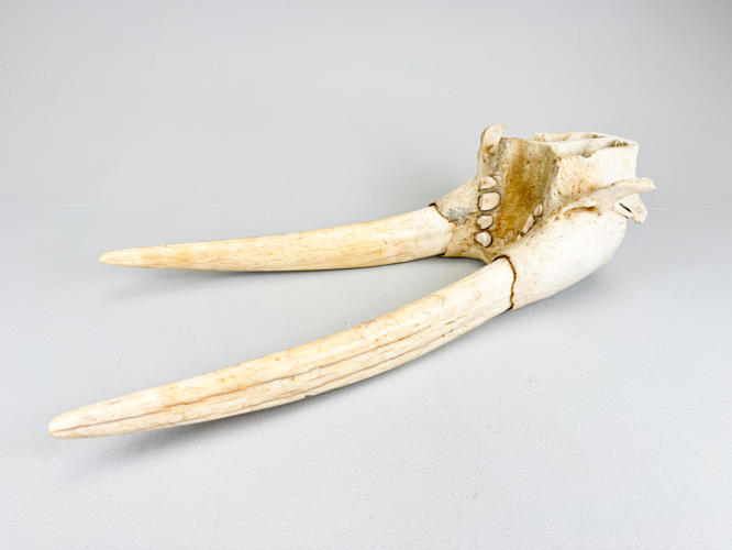 Hvalros kæbe med tænder. Højde i alt: 56 cm. Aldersrelateret patina. Kan sælges indenfor EU uden CITES.