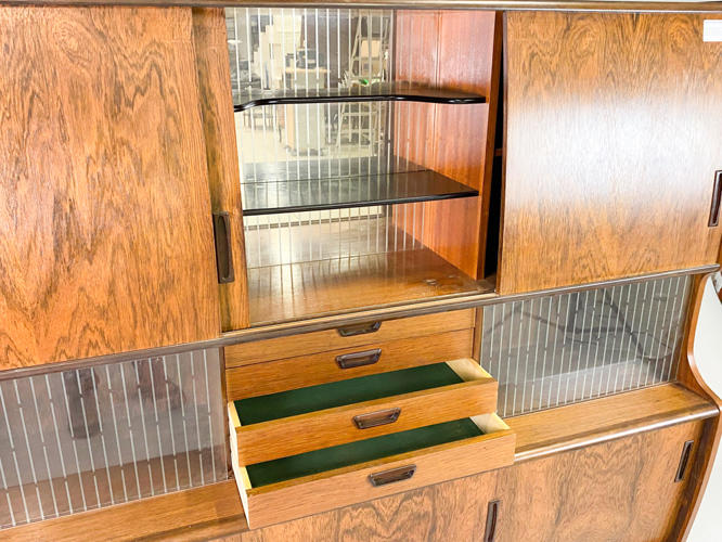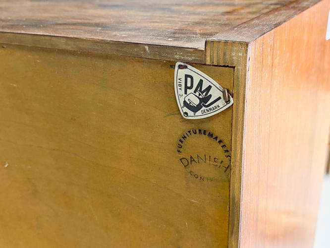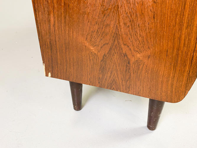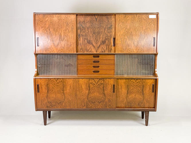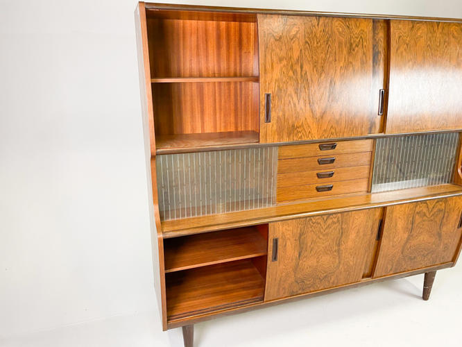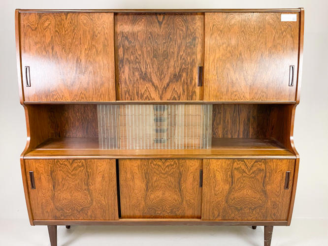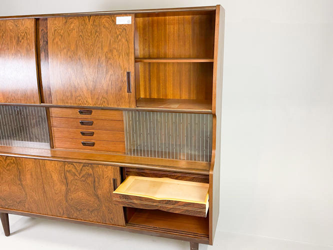 Høj skænk af palisander. Front med 6 skydelåger samt 4 skuffer. Produceret hos PMJ Viby. 168 x 42 x 159 cm. Fremstår med aldersrelateret slid samt enkelte finérafslag.