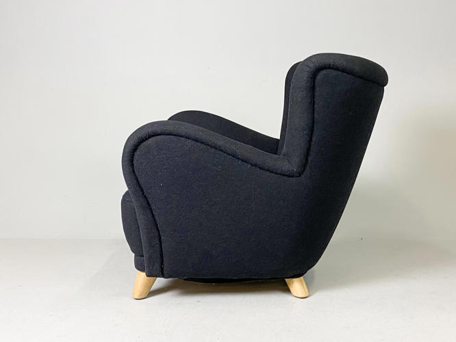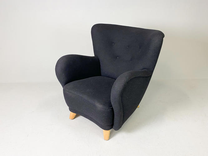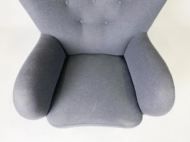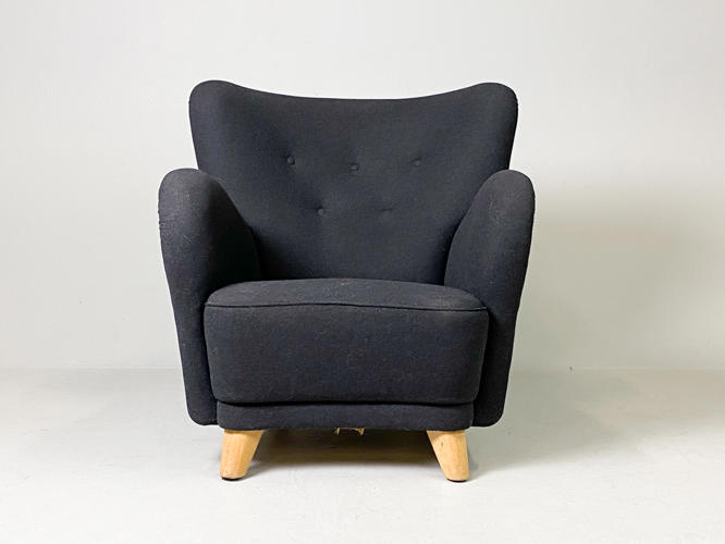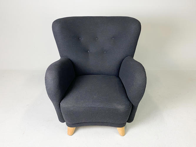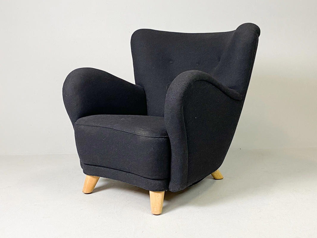 Overpolstret lænestol på tilspidsede ben af bøgetræ, senere betrukket med mørk gråt uld, enkelte brugsspor.