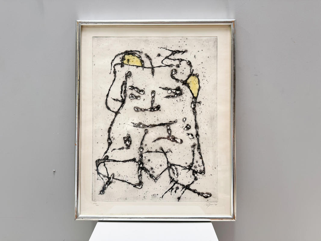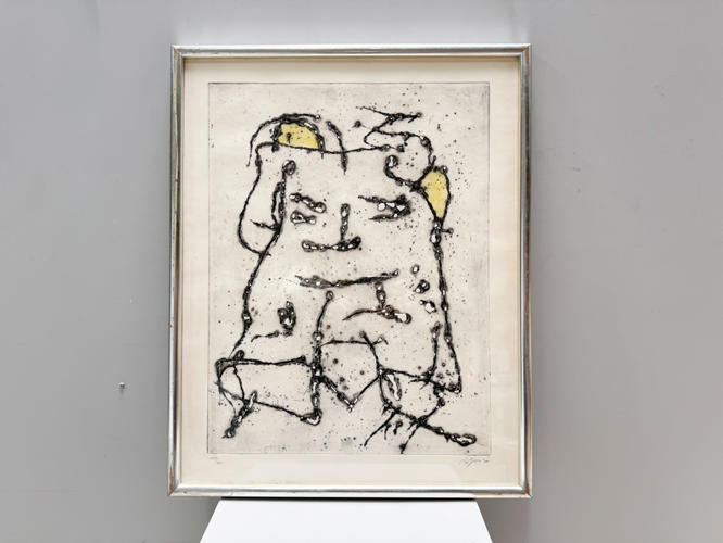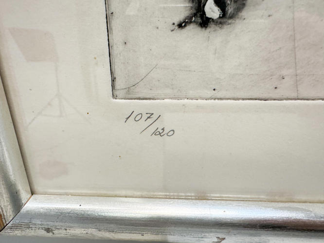 Carborundumætsning fra serien "Petroleumshandleren og hans familie". Signeret og nummeret med blyant 107/120. Trykmål 59 x 44,5 cm. (71 x 57 cm.) Auktion over kunstværker og kunstgenstande fra Odense Kommune.