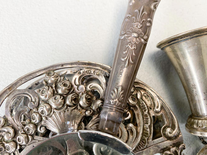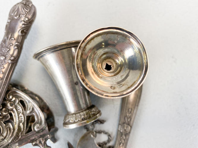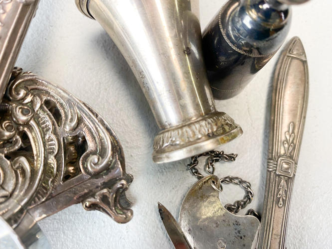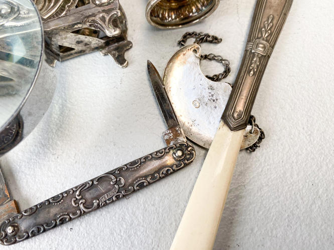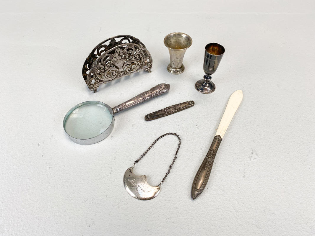 Toast rack, 2 små bægre, forstørrelsesglas, lommekniv, Madeira-flaskemærke samt brevkniv med blad af ben. Vægt uden 3 dele med stål/glas/ben ca. 104,1 g.
