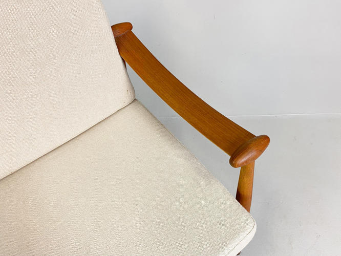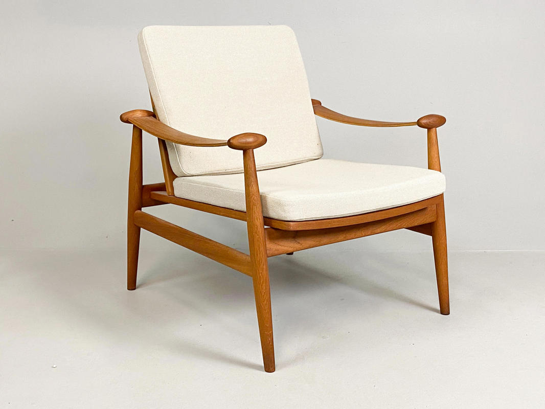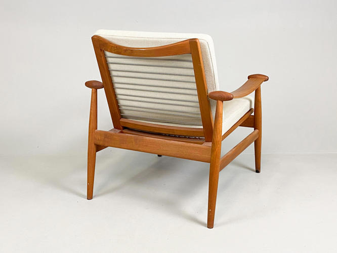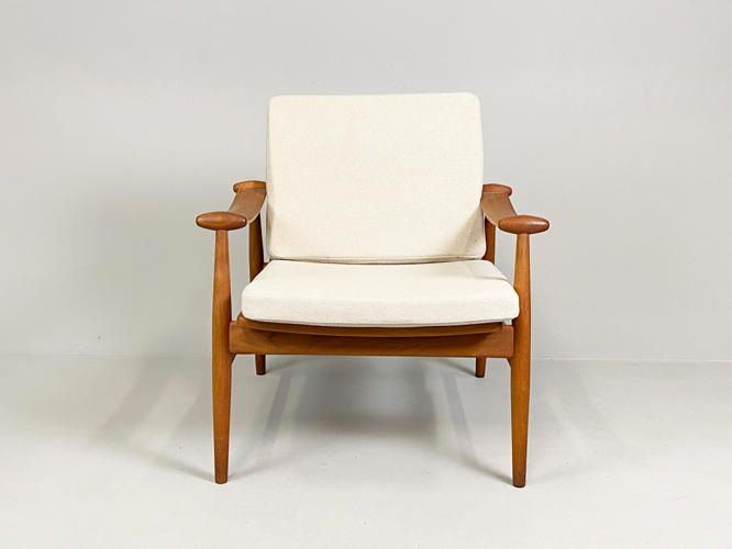 “Spadestolen”. Lænestol med stel af teak. Løse hynder i sæde og ryg betrukket med lyst uld. Model FD 133. Designet 1954. Udført hos France & søn