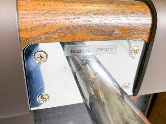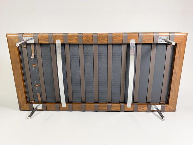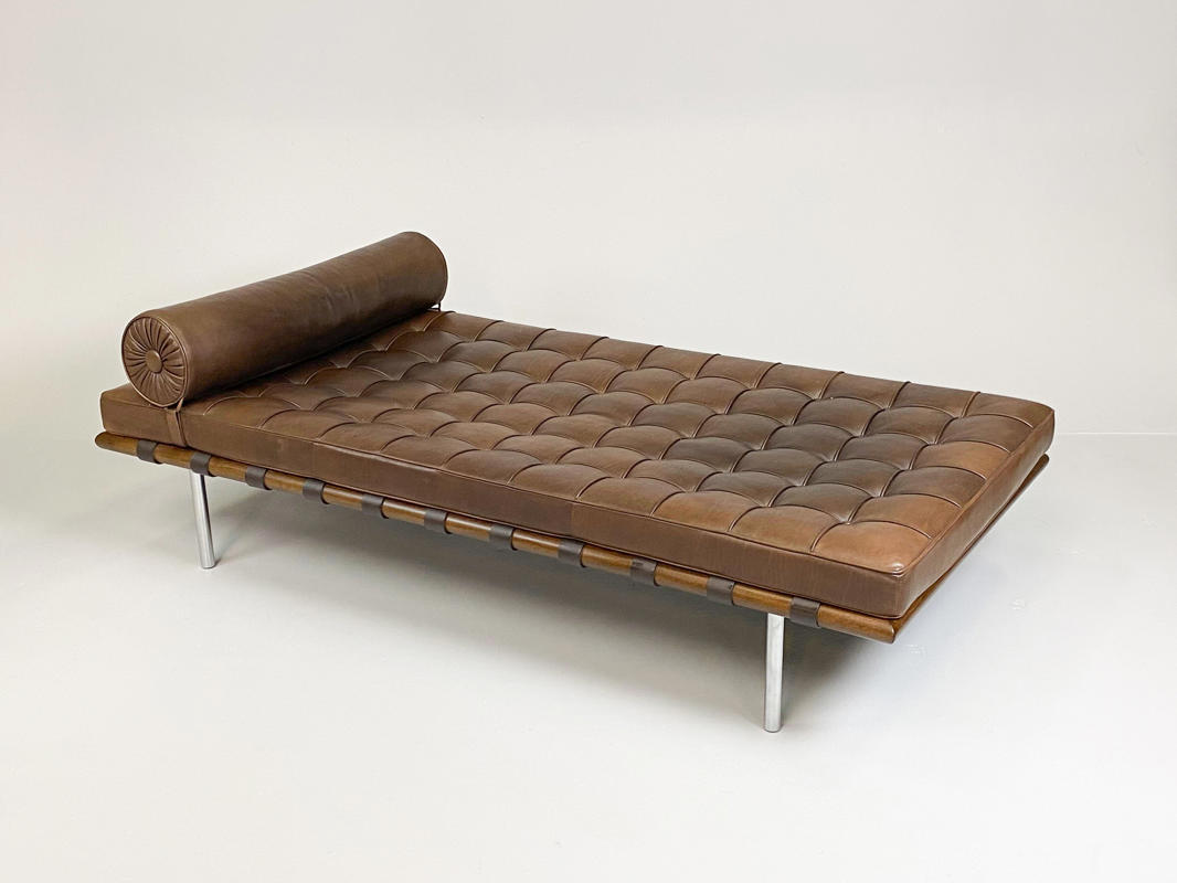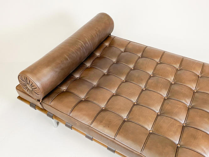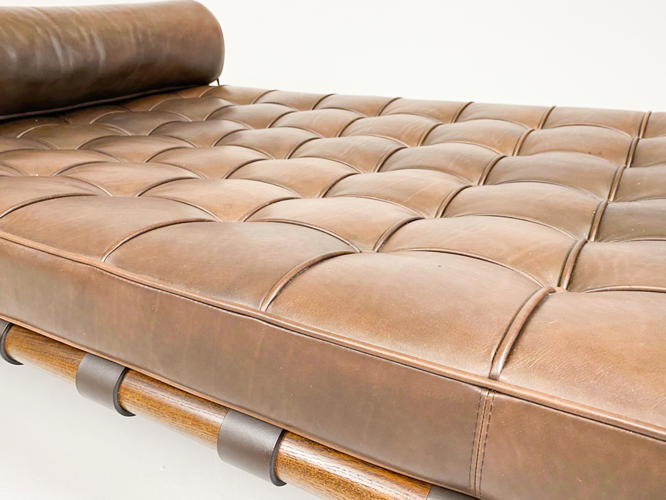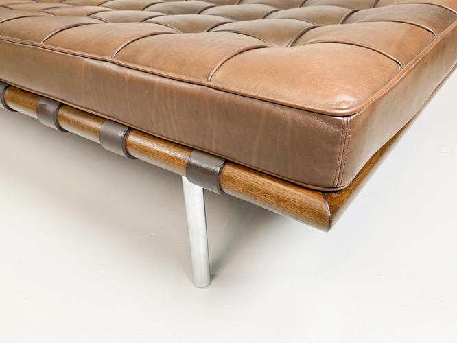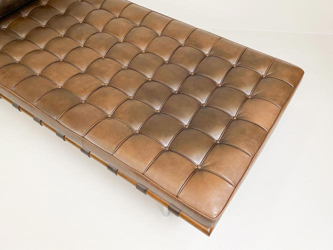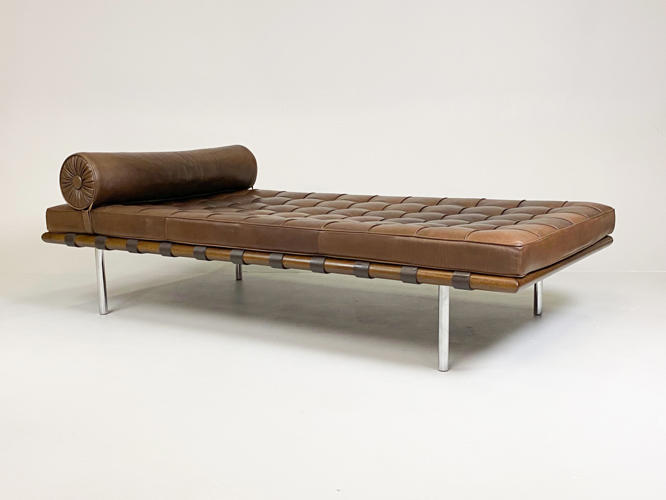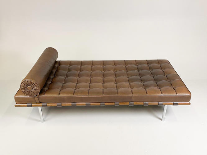 "Barcelona" daybed med stel af afrikansk Ramintræ udspændt med gjorde i kernelæder, ben i forkromet rustfrit stålrør. Hynde betrukket med knap og kedesyet brunt læder. Tilhørende nakkepude medfølger. Formgivet til verdensudstillingen i Barcelona år 1929. Fremstillet hos Knoll International med mærkat herfra. H. 41. L. 195. D. 95 cm.
