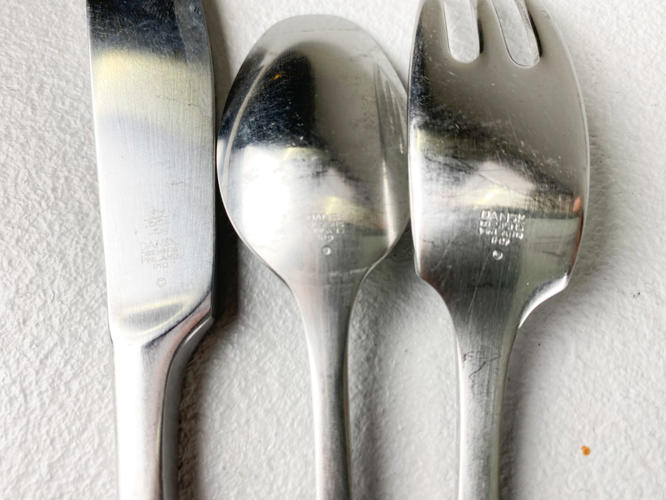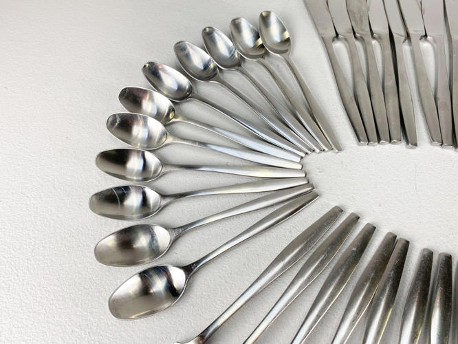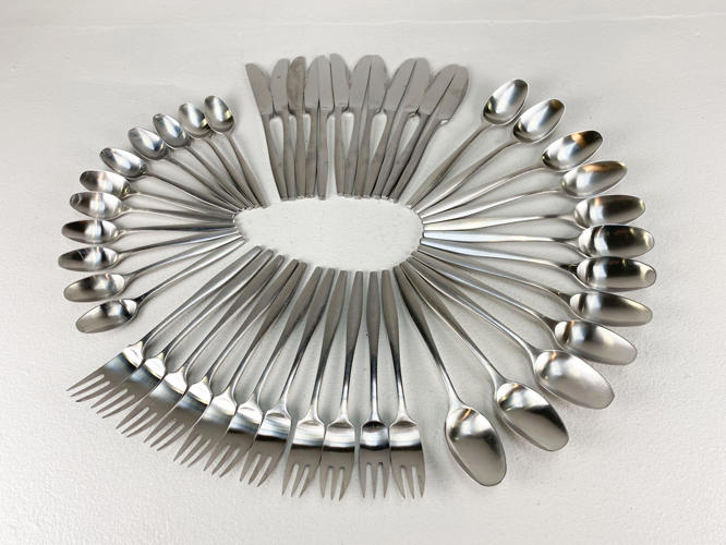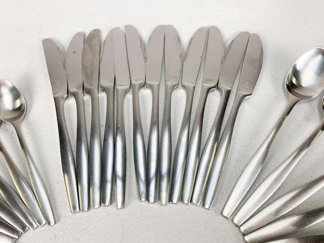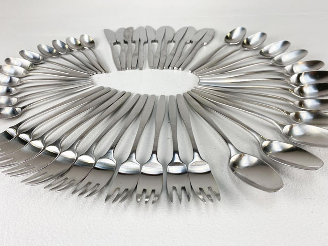 "Variation V". Dele til bestikservice af stål. Bestående af 12 middagsknive. 11 middagsgafler, 12 middagsskeer samt 11 dessertskeer. Designet i 1955. Stemplet IHQ. Produceret hos Dansk Designs Finland. Fremstår med aldersrelateret slid og -brugsspor.