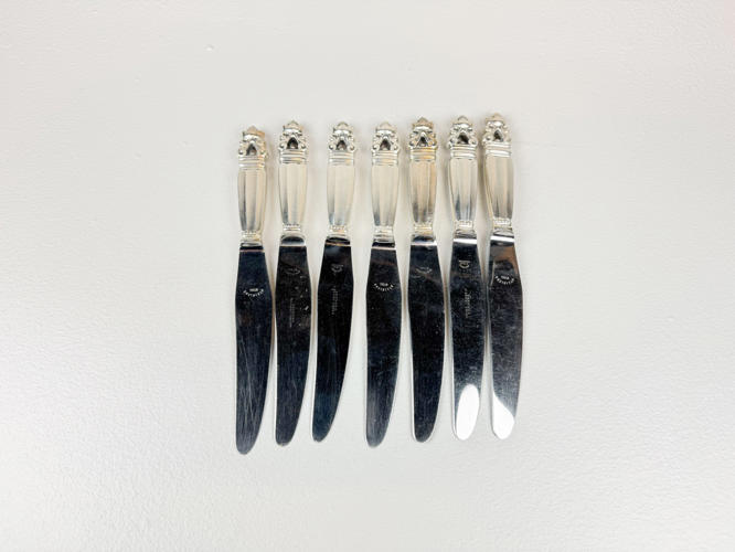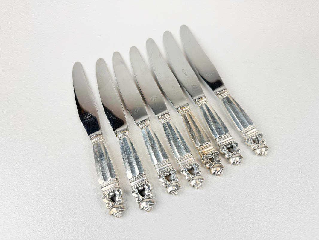 7 knive, 'Konge' / 'Acorn' tegnet af Johan Rohde i 1915, udført hos Georg Jensen. Skafter af sterlingsølv og blade af rustfrit stål. L. 23 cm. Brugsspor.