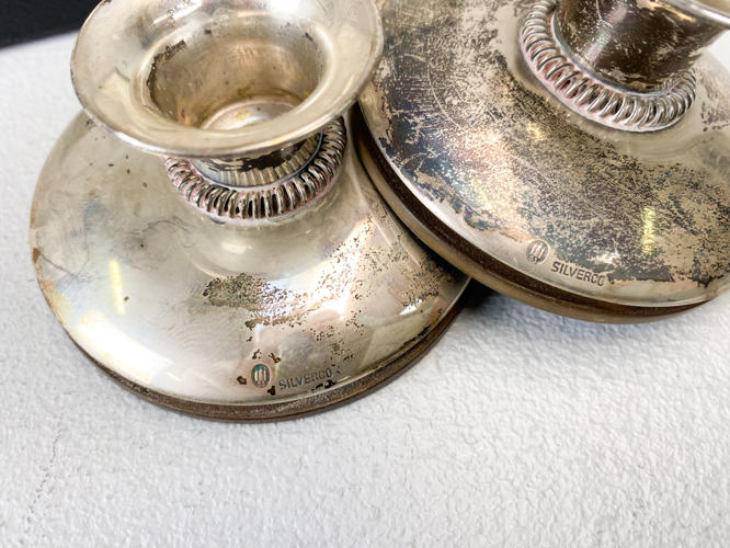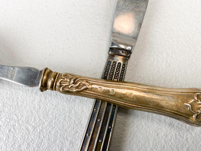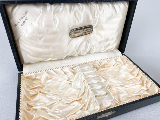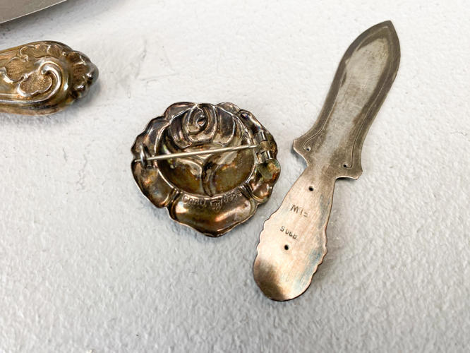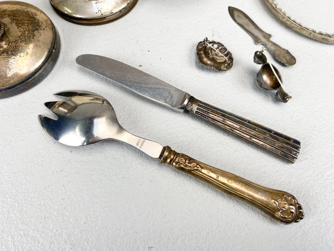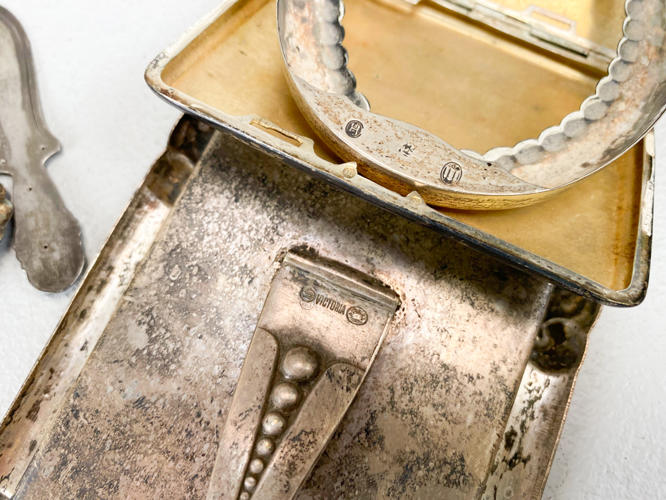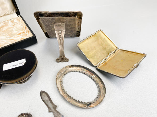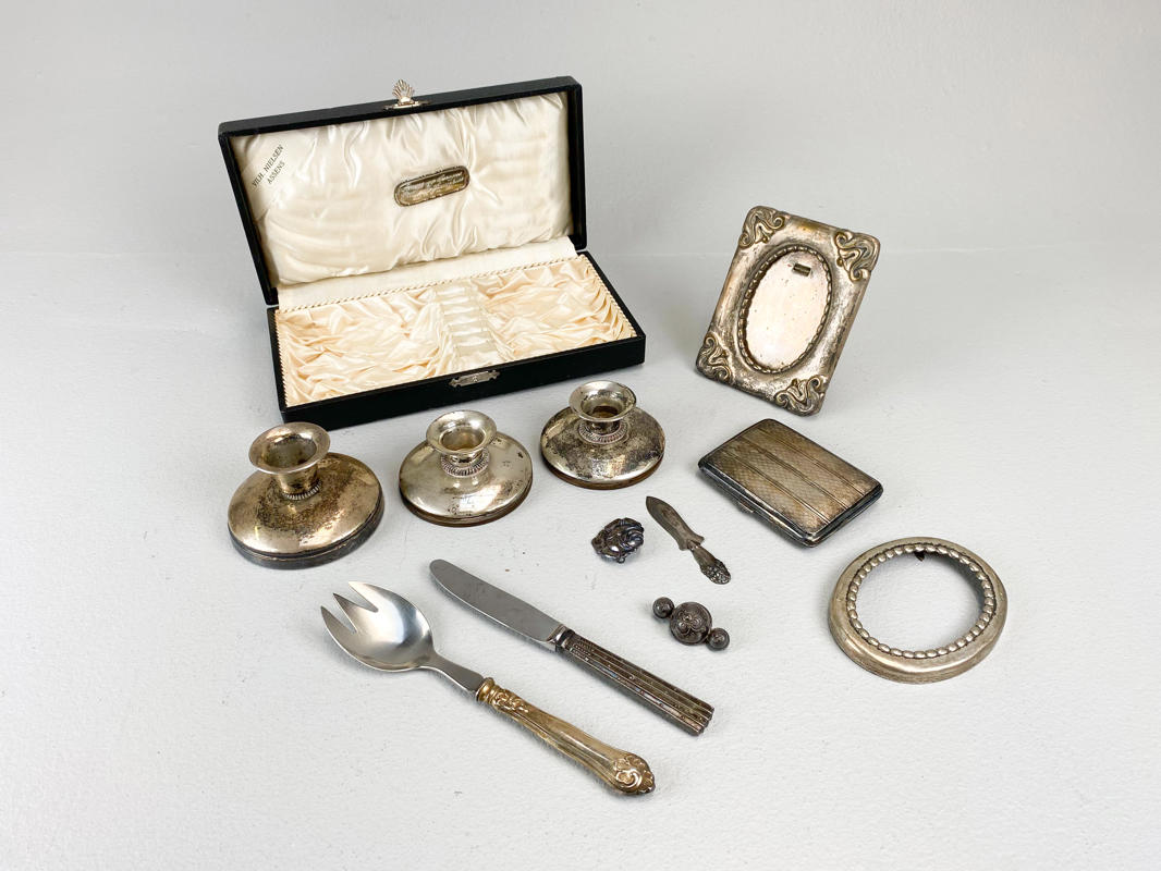 Samling sølv, 830. Bestående af cigaretetui, oval billedramme (uden bagside), bogmærke, 2 brocher, "Champagne" kniv, salatgaffel samt par lave art deco stager. Vægt uden 4 dele med stål, ca. 110,3 g. Billedramme samt lille stage af sølvplet medfølger.