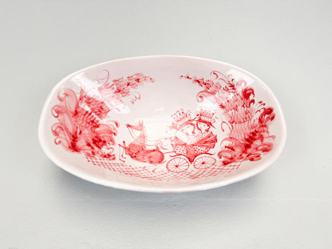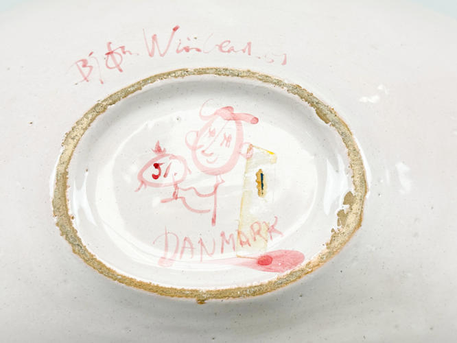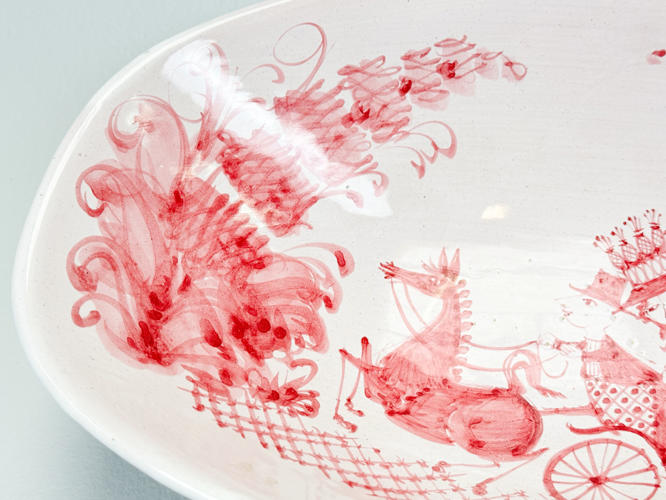 Aflang skål af lertøj. Dekoreret med lys glasur. Indvendig med hestevogn, mand samt 2 fornemme kvinder i røde farver. Signeret Bjørn Wiinblad Danmark 1951 samt med ansigt i bund, nr. 51. Unika. H. 8,5 cm. L. 29 cm.