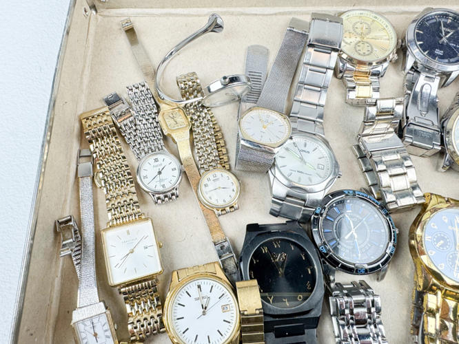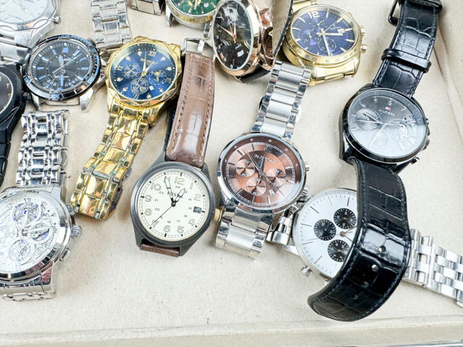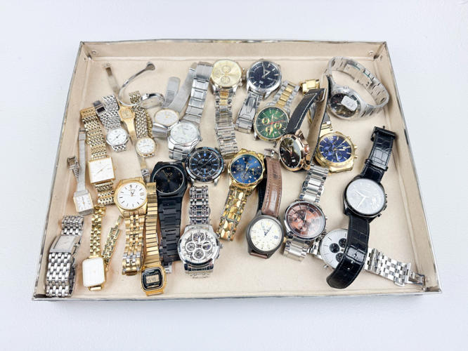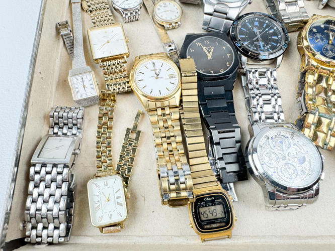 Carl Pique, Casio, Donna Karen, Festina, Fossil, Junghans, Lugano, Seiko, Skagen, Tommy Hilfiger m.m. 26 herre- og dameure. Kasser af stål, forgyldte m.m.