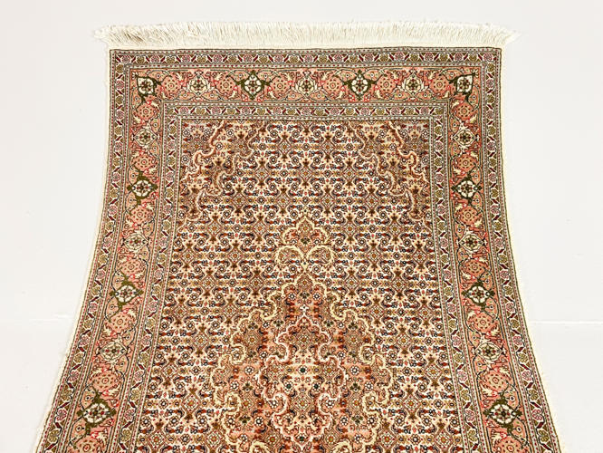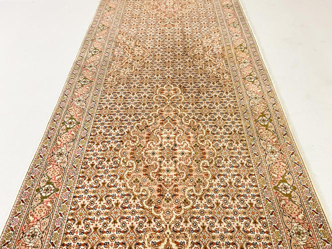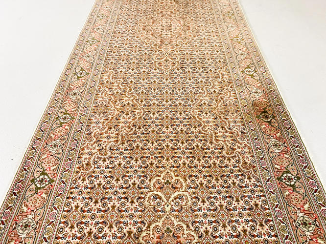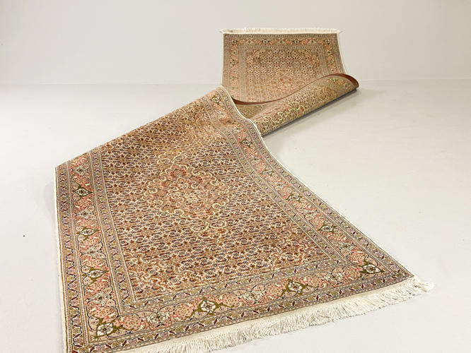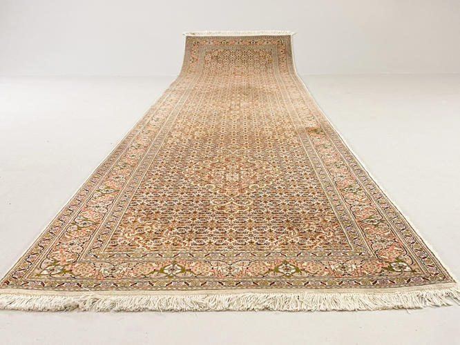 Løber / tæppe. Uld knyttet på bomuld. Tre medaljoner på 'Herati' mønstret bund. Ca 450.000 knuder pr. kvm. Brugsspor. Enkelte pletter. 80 x 352 cm.